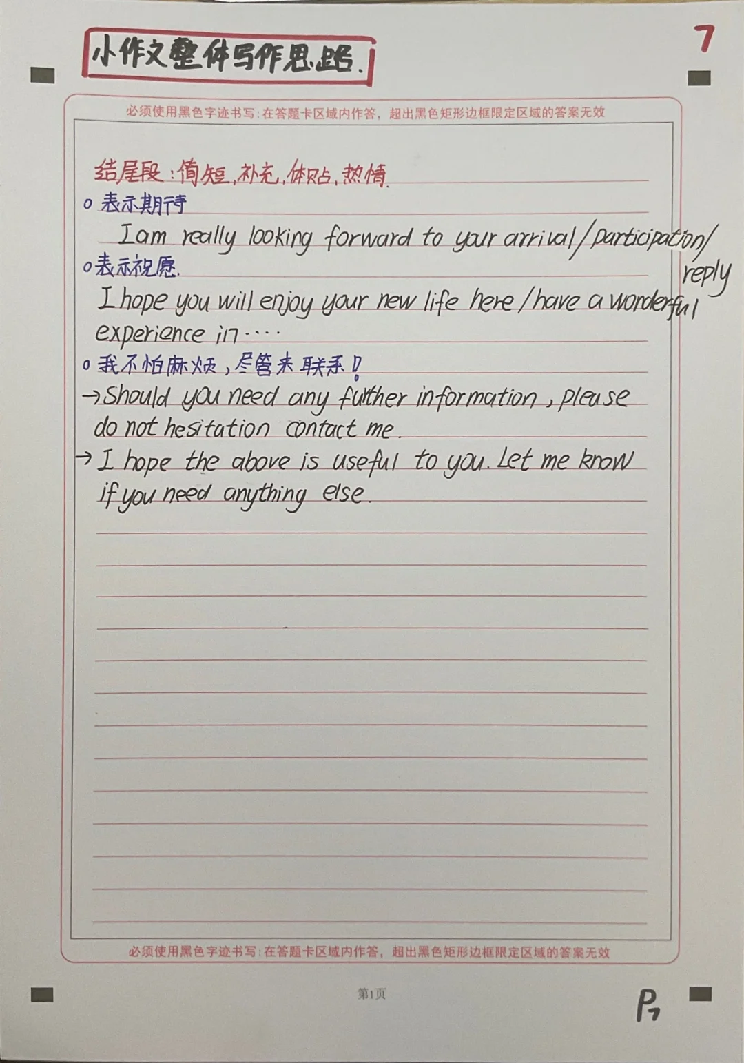 🌟结尾段:简短、补充、体贴、热情。