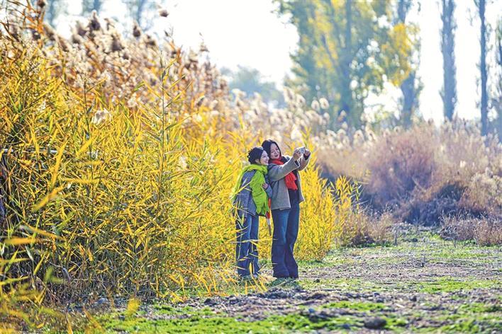 游客在八师石河子总场清泉集十一连芦苇荡里拍照留念(资料图片)。近年来,该连以“农文旅+产业融合”为发展方向,着力打造集民宿、采摘、观光等功能于一体的现代化新型生态连队,有力促进了职工群众增收和乡村振兴。雪峰耿照军摄