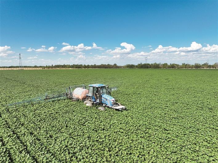 在六师共青团农场5G智慧农业试验基地,一台农机进行田管作业(资料图片)。该基地积极应用虫情测报灯、苗情摄像头、土壤墒情监测站、气象站、智能水肥一体机等先进设备和技术,农技人员据此可以远程实时掌握气象、光照、土壤、水分等信息,实现了农业生产智慧化。兵团日报全媒体记者邵明辉摄