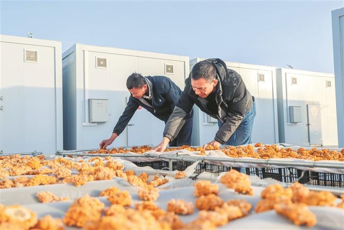 12月5日,在二师二十九团新疆万雨食用菌种植基地,工人晾晒刚刚采摘的黄金菇。二十九团通过招商引资大力发展食用菌产业,为团场产业结构调整、乡村振兴增添新动力。兵团日报常驻记者李嘉成摄