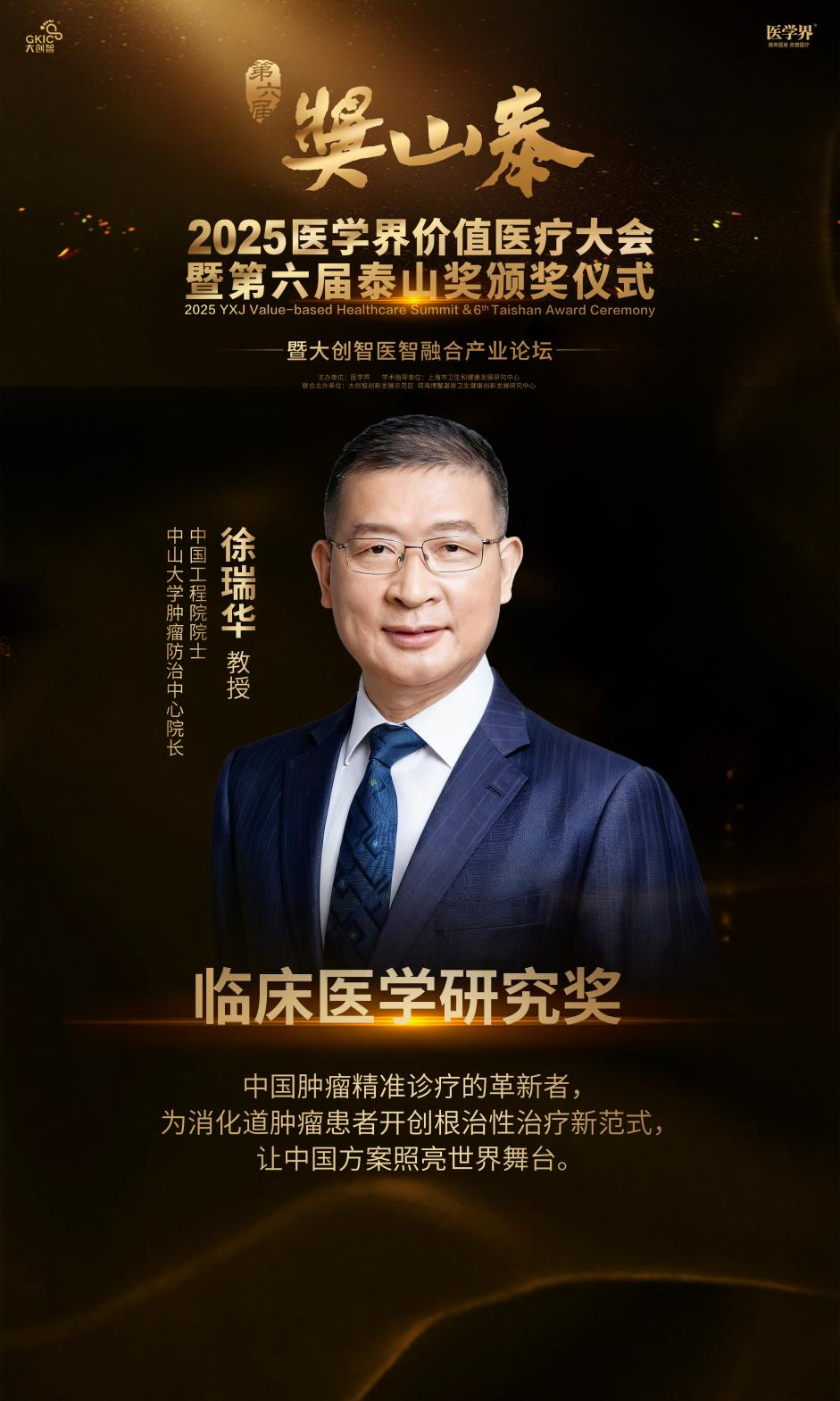 “泰山奖”自2019年由“医学界”创立,其命名取自“健康所系,性命相托,医者责任,重于泰山”,旨在为行业树立标杆,让价值的创造者被看见,推动价值医疗在中国产生更大的价值。