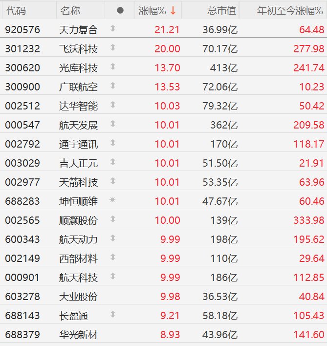 格隆汇12月8日|A股市场商业航天股掀涨停潮,截至半日收盘,天力复合涨超21%,飞沃科技20CM涨停,光库科技、广联航空涨超13%,达华智能、航天发展、通宇通讯、吉大正元、天箭科技、坤恒顺维、顺灏股份、航天动力、西部材料、航天科技、大业股份10CM涨停,长盈通涨超9%,华光新材涨近9%。