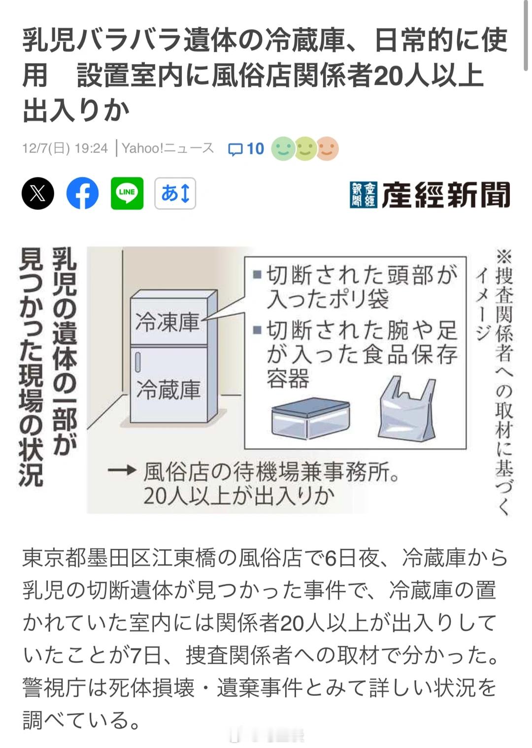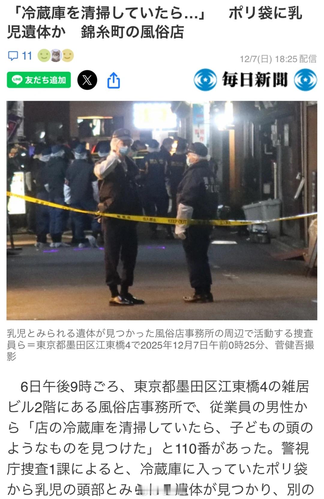 日本一风俗店惊现婴儿残尸,不到一岁,被发现时仅剩头部、手臂和腿部,暂未确定婴儿的性别…什么阴间新闻,个人猜测大概率是店内女子产子,但是弄死还切割就太惊悚了…12月7日,据全日本新闻网(ANN)报道,有人在东京墨田区一家风俗店的办公室冰箱内,发现一具新生婴儿的头部、手臂和腿部。据悉,6日晚,该店一名男性员工在清理办公室冰箱时,发现了这具残尸,由于尚未找到躯干。据警方调查,死者为出生数个月至1岁以内的婴儿,遗体切口显示曾被锋利刀具切割。躯干部位至今未找到,性别不明。头部和四肢被分别装入袋中,放置在冰箱冷冻层内,当时遗体处于冻结状态。涉事店铺为派遣型风俗店,该事务所同时也是女性员工的候工室。店方表示,每天约有20人出入该房间。该冰箱为公用设备,冷冻室内还存放着食品和饮料。案发地点位于JR锦糸町站南口附近的商圈,目前警方已以“损坏及遗弃遗体”案件立案调查中。日本一成人商店惊现婴儿残尸日本一成人商店冰箱惊现婴儿残尸