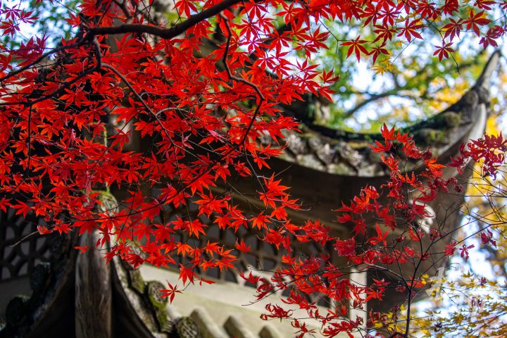 依山而建的永福寺里,一路都是鸡爪槭和红枫。没有固定的赏枫线路,五彩缤纷,三五成丛的鸡爪槭点缀穿插在整座寺院中,多了几分禅意的红叶,更有“枫”韵。