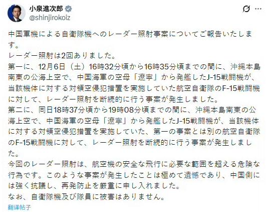 日本向中方提出强烈抗议,中国航母派出歼-15舰载机,用火控雷达照射日本自卫队F-15战斗机。 12月6日傍晚,辽宁舰编队在琉球群岛东南的国际水域按计划训练,提前三天通过国际海事组织公告了坐标范围,连民用航班都知道绕行。 可日本两架F-15偏要在演习区边缘反复横跳,第一次在歼-15触舰复飞时从后半球切入,最近时距航母不到150公里——这个距离对舰载机起降意味着什么?就像你在高速公路上倒车入库,突然有辆车贴着你保险杠按喇叭,飞行员本能反应是拉杆复飞,差点撞上甲板。 日方说第一次雷达照射持续3分钟,那是歼-15飞行员完成战术动作后,特意调整机头用雷达波束“点射”警告。火控雷达不是手电筒,每束电磁波都带着精确的锁定参数,F-15的告警器会像闹铃一样狂响。 但中方没开持续锁定,而是间歇式。这是教科书式的“可控威慑”,告诉对方:我看得见你,也能打你,但现在只是提醒。 两小时后的第二次照射长达31分钟,因为日方换了架F-15继续逼近。这次歼-15双机编队直接包夹,雷达波束像探照灯跟着转。日本飞行员后来在内部报告里承认,告警器时断时续的31分钟里,他们尝试了三次战术规避都甩不开,最终只能向西脱离。 这种“猫捉老鼠”的压制,恰恰证明中方全程掌握主动权——真要动手,霹雳-15导弹的射程是F-15挂载的AAM-4导弹两倍,日方连告警机会都没有。 关键问题在于日本战机的意图。他们飞临的位置是航母战斗群的核心防御圈,F-15去年刚挂载JASSM远程导弹,320公里射程足够对辽宁舰构成威胁。 更别说今年4月“大波”号驱逐舰穿航山东舰舰艏,6月P-3C反潜机贴脸侦查,日方已经把抵近骚扰当常态化操作。 这次选在周末加班发布辽宁舰动向,凌晨紧急召开发布会,声线发颤的小泉进次郎闭口不提F-15携带的弹药,只说“危险行为”,像极了2016年他们发射干扰弹后反诬中方的套路。 歼-15的雷达照射是间歇性的,这是典型的“警告性锁定”,和实战中持续跟踪直到发射的模式完全不同。日本防卫省故意混淆“搜索雷达”和“火控雷达”的概念,却不敢提他们的F-15在2016年曾用火控雷达照射过苏-30。共同社事后悄悄补充:辽宁舰活动“没有越界”,这等于抽了自家防卫省的脸。 这场风波本质是海权博弈的缩影。当辽宁舰成为西太平洋常客,日本再也不能像过去那样随意抵近侦察。今年山东舰穿越宫古海峡时,自卫队舰艇跟踪导致12名官兵晕船呕吐的照片被内部曝光,说明他们的“专业监视”越来越吃力。 这次歼-15的雷达波束,实际上是划了条看不见的红线:公海训练不是靶场,贴脸挑衅就得付出代价。 其实这个时间点也很有看头,12月6日是高市早苗发表涉台错误言论的第5天,日本急需转移国内视线。防卫省选在凌晨发消息,配合右翼媒体的“中国威胁论”炒作,连发布会背景板都特意露出“防卫相”胸牌。 这出戏的政治表演成分,远大于军事冲突本身。就像去年菲律宾在仁爱礁碰瓷,事前都要找好“国际观众”。 从宫古海峡到巴士海峡,中国航母的每一次远海训练,都是对“第一岛链”的实质性突破。日本想维持“家门口的监视权”,却忘了国际法里没有“专属侦察区”。 歼-15的雷达波不是第一次,也不会是最后一次。当日方明白“无害通过”不等于“无限制挑衅”,这类闹剧才会真正收场。毕竟在现代海战中,敢闯进航母防空圈的,要么是敌人,要么是找死的人。