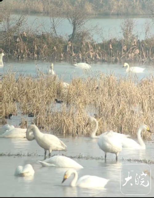 大皖新闻讯12月8日上午,环巢湖湿地生态监测团队在十八联圩湿地观测到346只小天鹅在此栖息,洁白的身影与碧水相映成趣,场面壮观。