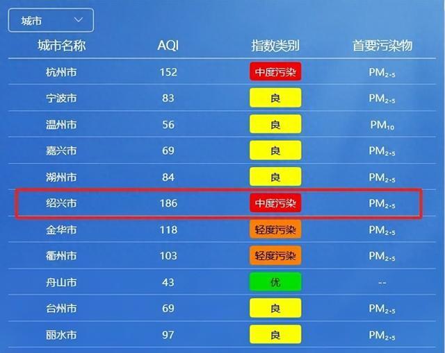 浙江省环境空气质量指数(AQI)发布平台显示,今天12时,绍兴的空气质量已达到了中度污染。