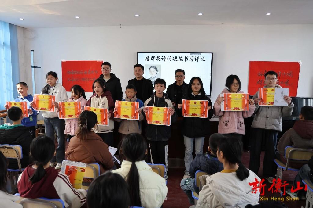 活动最后,学校举行唐群英诗词硬笔书写比赛颁奖仪式。此前,学校面向全体学生发起征稿,同学们将对革命先驱的敬仰之情融入笔端。一幅幅气韵生动的书法作品,尽显少年意气与文化底蕴。校领导为获奖学生颁发奖状与奖品,号召师生在翰墨飘香中感悟传统文化魅力,传承群英精神风骨。