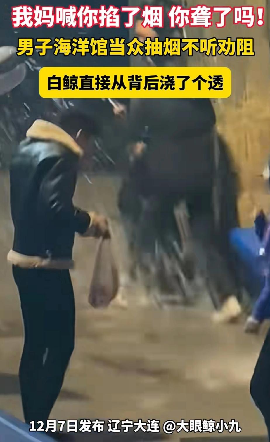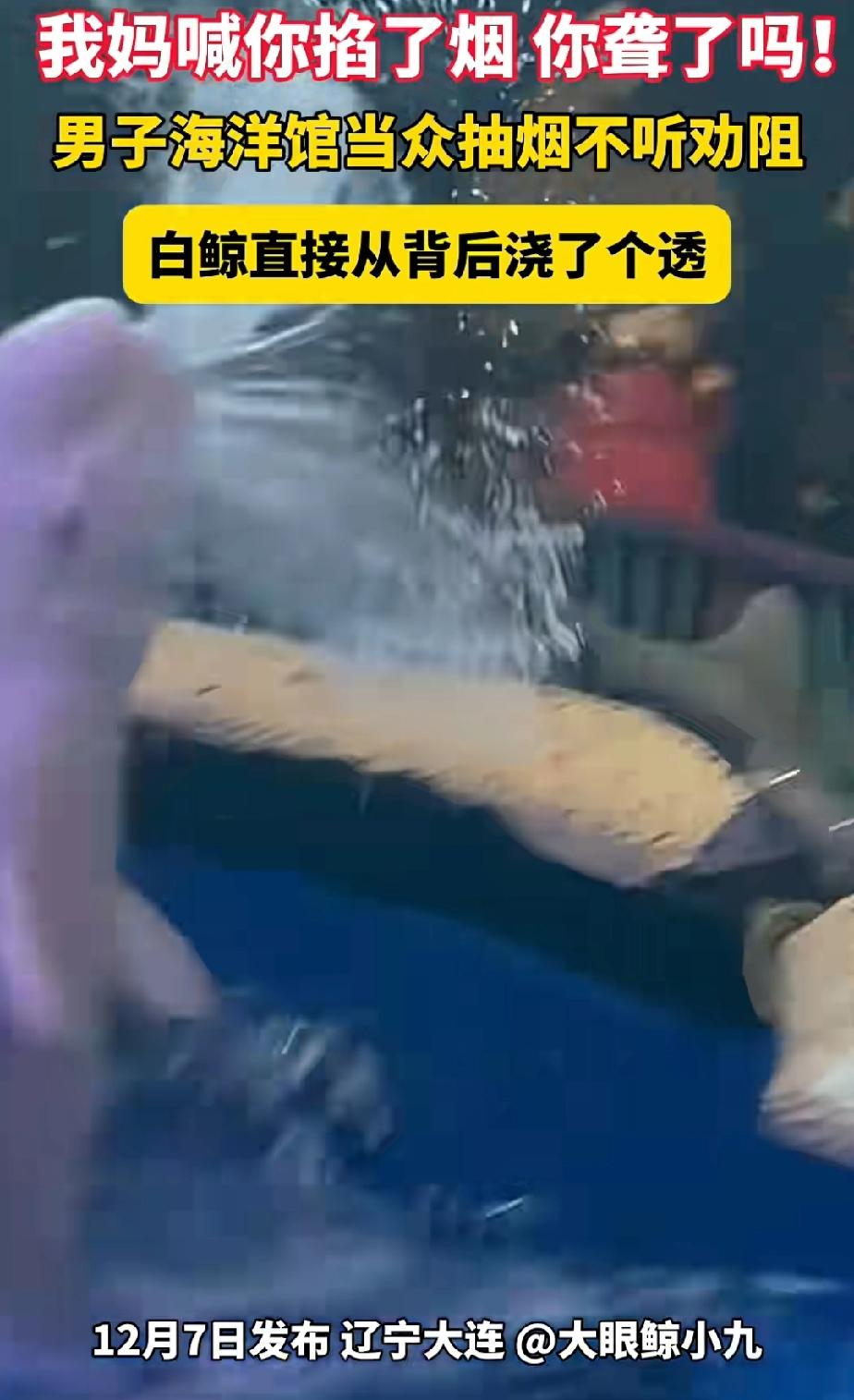 辽宁大连,一男子在海洋馆中,旁若无人地吸烟,工作人员前去劝阻,可男子不听。 好了,你不听劝,就有吃亏的时候。 规劝的工作人员刚离开,水中的白鲸不乐意了,一口水喷出来,正好对着吸烟者后背,兜头浇下来。好像在说,“让你不听话!” 也不知道是白鲸听懂人话了,还是碰巧,反正是给了男子一个教训。 生活中有些人,没有大局观,公共场合我行我素,不遵守规则。海洋馆明明有规定,里面禁止吸烟,有人就是不听,视规定如空气,置若罔闻,工作人员前去制止也不听,非得按自己的意愿行事。 俗话说,到人家的地盘了,就得服人家管,人家有规定,禁止吸烟,别人都能遵守,你为什么就不能遵守呢? 现实中还真有不少这样的人,就爱跟人对着干,不知道大家遇到过没有?大家都是怎么处理的? 图片来自网络,侵删致歉!