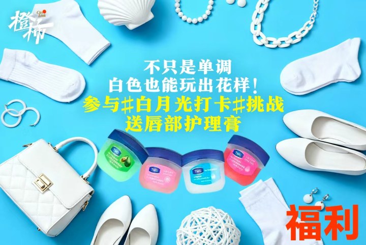 活动参与方式:在橙友圈#时髦经#话题下带#白月光打卡#的标签发帖,晒出生活中白色的物品,可以是装饰品、包包、鞋袜或是项链、耳环任何的包装元素等等。