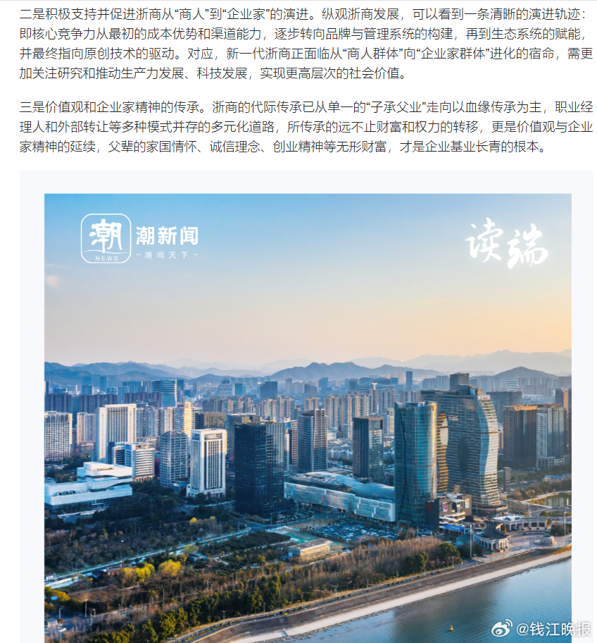 #浙江给民企接班人们开了个会# 【读端丨这场会聚焦浙商“后浪” 秦诗立:在赓续浙商精神中赋能薪火相传】近日,全省“两个健康”集成改革暨促进年轻一代民营经济人士高素质成长试点工作会议在省人民大会堂召开。相关部门负责人、商会和企业代表等参加,除主会场外,11个设区市均设分会场,足见会议的重要性。民企传承,往小说是“家事”,往大了说是“国事”。对浙江来说,年轻一代能否接好父辈打下的“江山”,关系民营经济发展前景,关乎区域高质量发展。(潮新闻 编辑 吴盈秋)