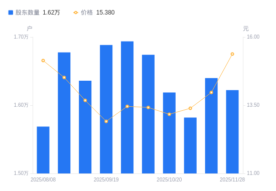 日期A股户数(户)流通A股户均持股数(股)户均持股市值(万元)2025-11-281622341007.5863.072025-11-201639940567.2756.672025-10-311581942054.5856.312025-10-201618741098.5054.132025-10-101674039740.8253.332025-09-301693839276.2652.872025-09-191688439401.7850.872025-09-101636140655.6655.622025-08-291677539677.1957.612025-08-081568742429.0764.24