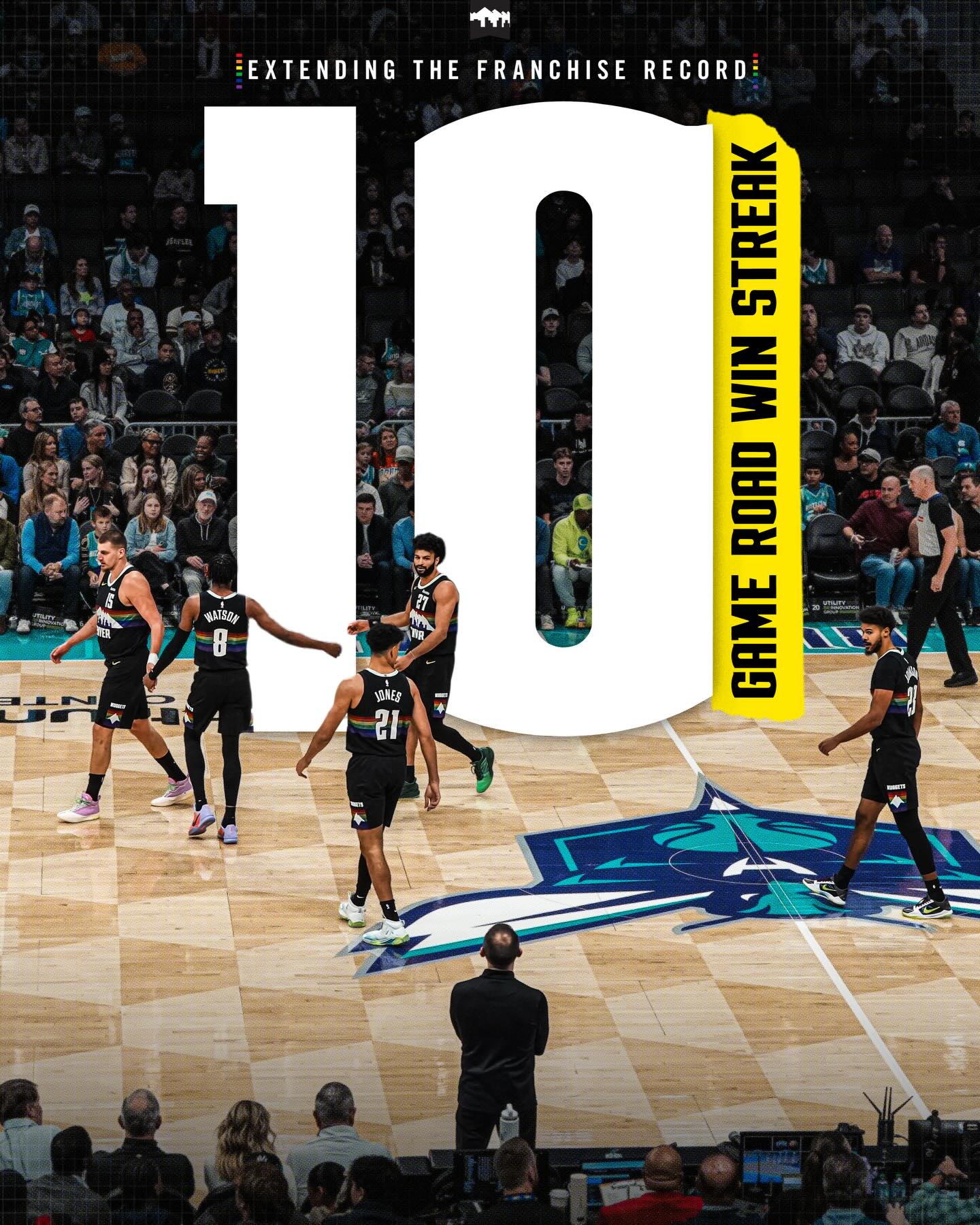 此役获胜后,掘金在客场豪取10连胜,继续刷新队史纪录。