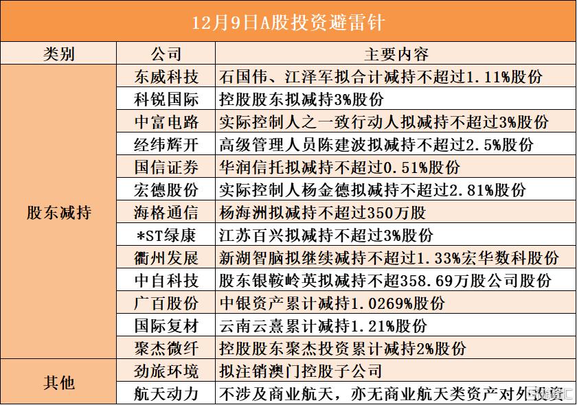 东威科技股东石国伟、江泽军拟合计减持不超过1.11%股份;科锐国际控股股东拟减持3%股份;中富电路实际控制人之一致行动人拟减持不超过3%股份;经纬辉开高级管理人员陈建波拟减持不超过2.5%股份;宏德股份实际控制人杨金德拟减持不超过2.81%股份;*ST绿康股东江苏百兴拟减持不超过3%股份;衢州发展股东新湖智脑拟继续减持不超过1.33%宏华数科股份;中自科技股东银鞍岭英拟减持不超358.69万股公司股份;航天动力不涉及商业航天,亦无商业航天类资产对外投资