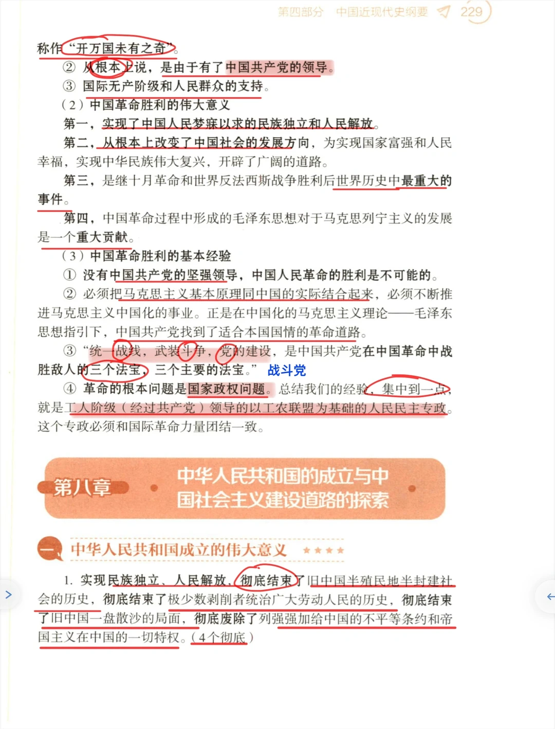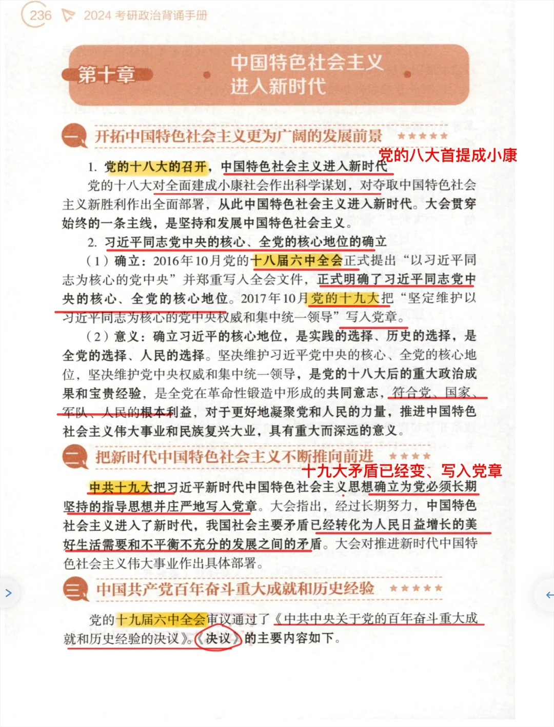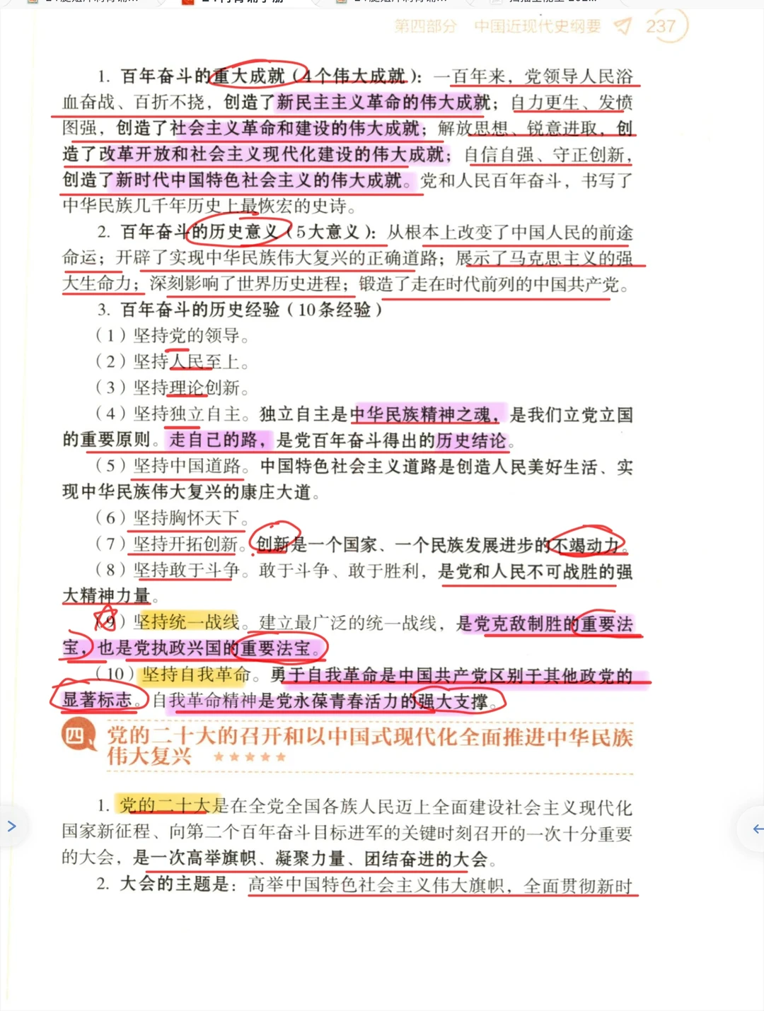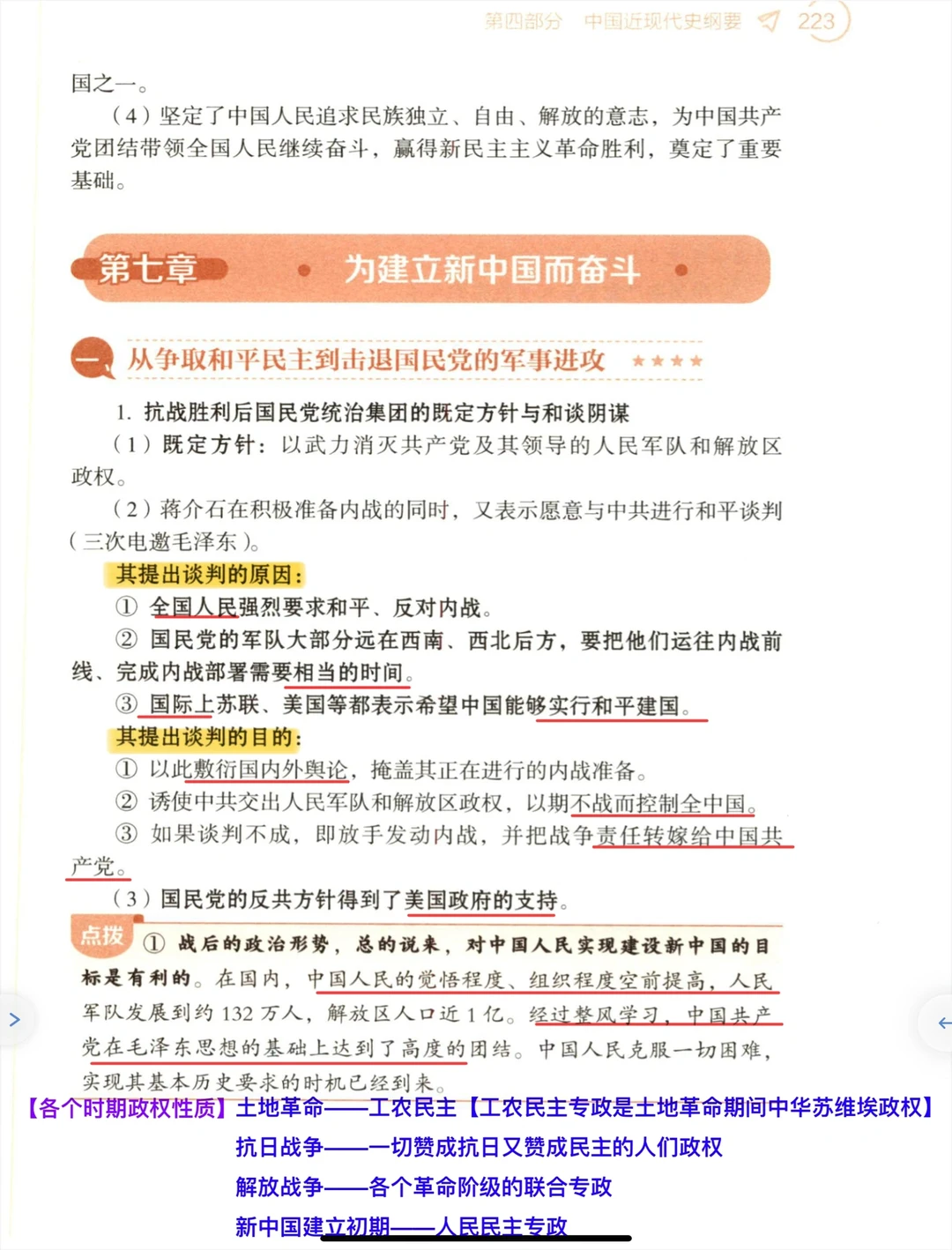 🌟整理【肖1000➕腿姐技巧班➕徐涛强化笔记】至肖秀荣冲刺背诵手册。 🌟史纲完结 第七章为建立新中国而奋斗 第八章中华人民共和国成立 第九章改革开放与中国特色社会主义开创和发展 第十章中国特色社会主义进入新时代 🌟P223—236 知识点📌大家学习完几章,记得刷题自测巩固一下知识点❗️
