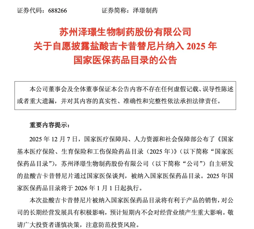 例如,泽璟制药盐酸吉卡昔替尼片通过国家医保谈判,被纳入国家医保药品目录。盐酸吉卡昔替尼片治疗中、高危骨髓纤维化适应症是首个获批用于治疗骨髓纤维化的国产JAK抑制剂类创新药物,并获得国家“重大新药创制”科技重大专项立项支持。