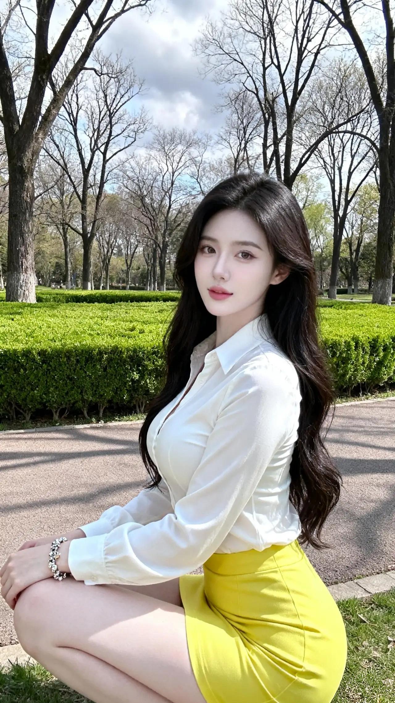 分享美女穿搭服饰白衬衫黄色短裙高跟鞋