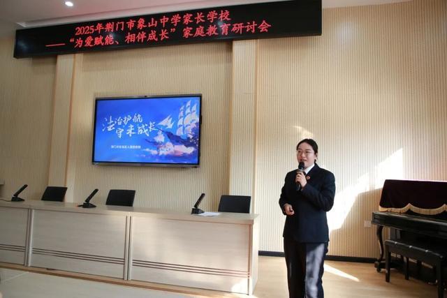 家庭是人生的第一课堂,父母是孩子的第一任老师。为深入贯彻《中华人民共和国家庭教育促进法》,助力家长树立科学育儿观念,搭建家校社协同育人桥梁,12月5日,荆门市象山中学家长学校“为爱赋能、相伴成长”家庭教育研讨会上,荆门市东宝区检察院检察官杨翰琳受邀,为现场家长带来了一场干货满满的“依法带娃”专题辅导课,让法治理念与科学育儿知识深度融合,为未成年人健康成长保驾护航。