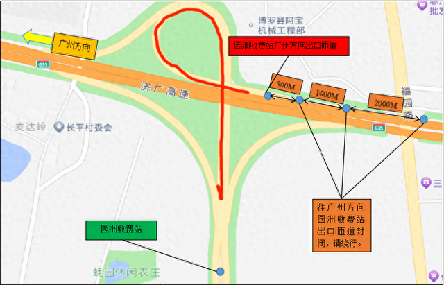 其中,12月13日8:00至12月14日18:00,济广高速园洲收费站东往西(惠州往广州)方向出口匝道封闭,禁止车辆通行。往园洲的车辆可提前在罗浮山收费站下高速绕行广汕公路、538乡道,或在石湾收费站下高速绕行585乡道。