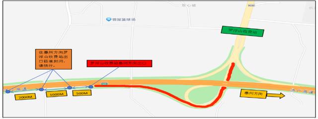 罗浮山收费站惠州方向出口匝道封闭示意图。
