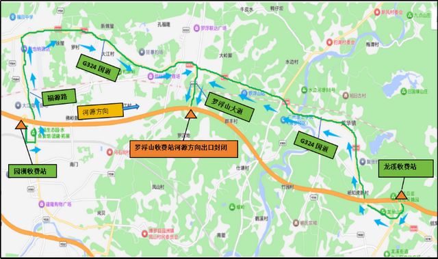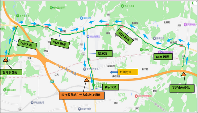 罗浮山收费站惠州方向出口封闭绕行示意图。