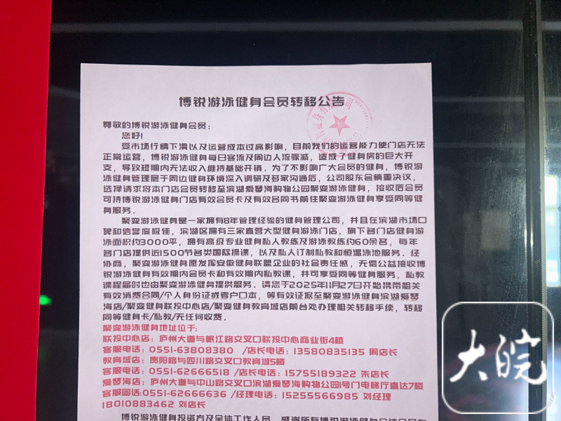 记者注意到,门店门上贴有《博锐游泳健身会员转移公告》。公告显示,受市场行情波动及运营成本过高影响,门店已无法正常运营,现决定将会员权益转移至滨湖爱琴海购物公园聚变游泳健身店;接收后,会员可持博锐游泳健身门店有效会员卡及有效合同书前往聚变游泳健身享受同等健身服务,转移健身卡/私教课程无任何额外收费。