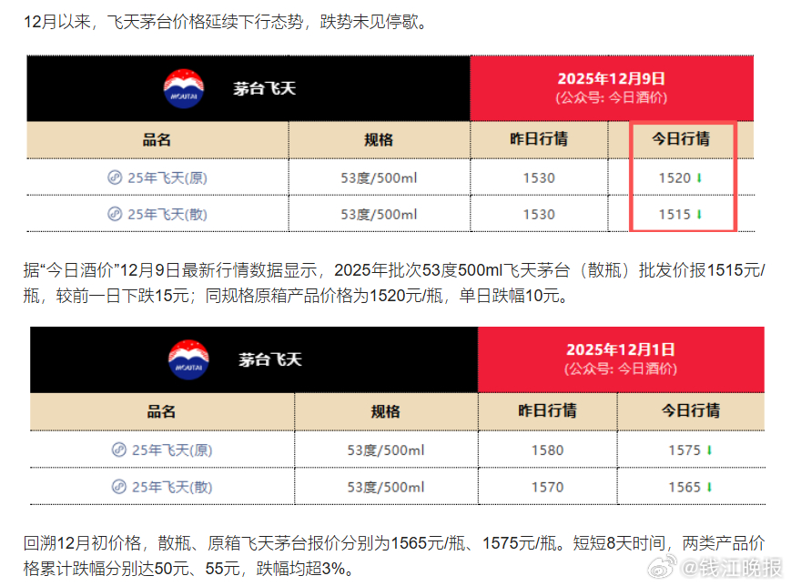 【 #茅台跌出近年新低# 1399元触底了吗?】12月以来,飞天茅台价格延续下行态势,跌势未见停歇。据“今日酒价”12月9日最新行情数据显示,2025年批次53度500ml飞天茅台(散瓶)批发价报1515元/瓶,较前一日下跌15元;同规格原箱产品价格为1520元/瓶,单日跌幅10元。回溯12月初价格,散瓶、原箱飞天茅台报价分别为1565元/瓶、1575元/瓶。短短8天时间,两类产品价格累计跌幅分别达50元、55元,跌幅均超3%。值得关注的是,2025年以来飞天茅台价格更是单边下行的“腰斩”式下滑:年初其批发价稳定在2200元/瓶左右的高位,随后开启持续下跌通道——6月首次跌破2000元整数关口,8月快速失守1800元,10月底再度击穿1700元防线,11月末更是触及1590元/瓶的阶段性低点。从6月至11月的半年时间里,价格累计跌幅已超25%,下行速度与幅度均超出市场预期。作为参考,该产品出厂价为1169元/瓶,官方市场指导价为1499元/瓶。记者在多家电商平台查询发现,目前散瓶飞天茅台通过拼团、补贴等促销方式,最低到手价仅1399元/瓶,较官方指导价低100元,正式击穿指导价防线。拉长时间线看,上一次茅台显著跌破市场指导价是在2013年前后。公开资料显示,2012年初其批发价最高约1875元,2013年受政策调整与行业信任危机影响,价格一路暴跌至819元的出厂价附近,部分时段甚至低于出厂价,远超当时800-1000元的市场指导价区间,跌幅高达60%。此次下跌持续时间长达近四年,直到2016年上半年价格才逐步筑底反弹。对比历史走势,2025年茅台再度跌破官方指导价,价格何时能企稳反弹,成为市场关注焦点。在业内人士看来,飞天茅台作为高端礼品与宴席场景的刚需属性并未改变,其承载的社交价值依然稳固。白酒行业分析师蔡学飞指出,当前飞天茅台价格下探,实则显著降低了消费门槛,有望触达更广泛的消费群体;而随着消费人群的扩容与消费场景的进一步拓展,市场真实需求将持续释放。蔡学飞判断,结合春节消费旺季临近的节点,从宏观趋势来看,茅台价格已逐步进入企稳区间,短期内的价格小幅震荡,更多是部分电商平台与商户的营销造势行为,并未改变其长期价值逻辑。(潮新闻 记者 俞叶波)