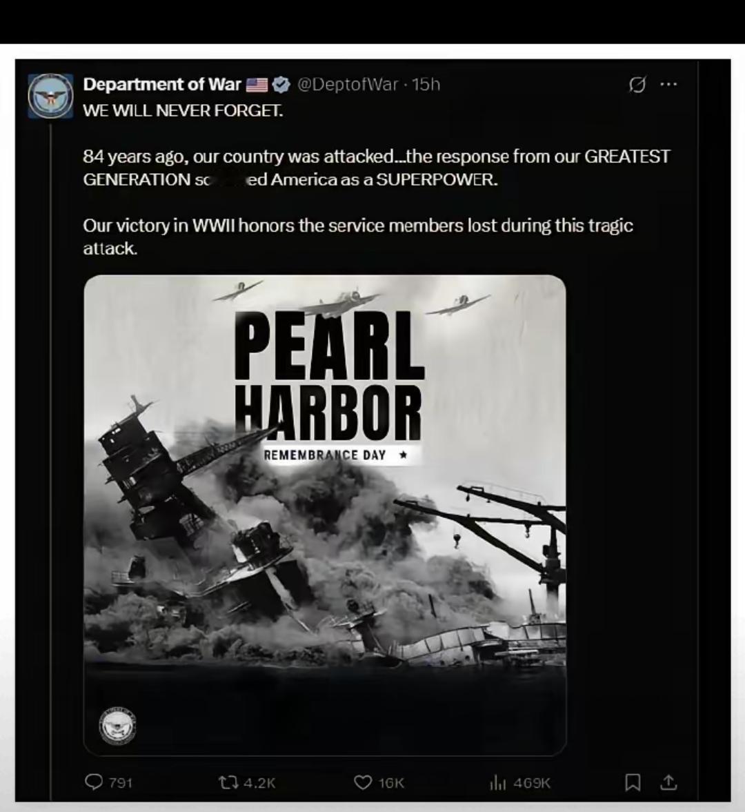 看美国纪念珍珠港遇袭84周年的操作,越看越觉得讽刺,所谓的“永远不会忘记”,本质就是利益优先的虚伪说辞。明明是日本偷袭珍珠港,造成2400多名美国人丧生,可美国国防部的纪念海报不仅刻意不提凶手是日本,就连海报上的敌机都混进了自己的轰炸机,错得离谱又尴尬。 说到底,美国不是忘了仇恨,只是现在需要拉拢日本当战略棋子,就故意淡化历史、回避罪责。可日本高官屡屡参拜靖国神社,甚至给珍珠港袭击策划者献花,压根没正视过罪行,美国的纵容只会让军国主义抬头。 铭记历史从不是喊口号,连凶手都不敢提的纪念毫无意义,只会寒了遇难者的心。你们觉得这种刻意回避凶手的纪念,真的能起到警示作用吗?