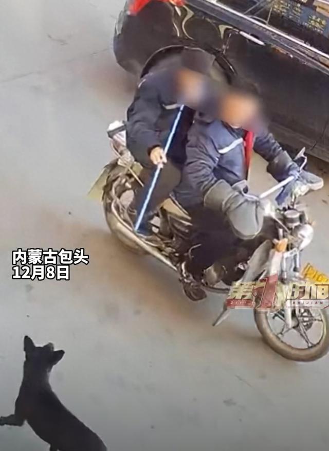 12月8日,内蒙古包头。2个骑摩托车男子用吹管偷狗被抓。狗狗比较聪明,被扎针后反向跑进隔壁店内。