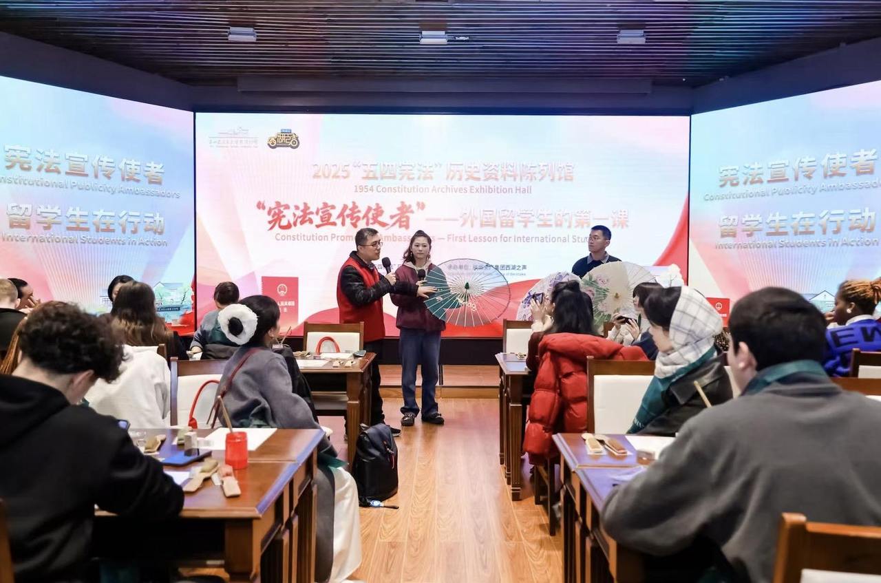 12月7日,“五四宪法”历史资料陈列馆联合在杭高校国际教育学院、西湖绸伞非遗传承人,成功举办“2025年宪法宣传使者——外国留学生的第一课”活动。来自浙江大学、浙江工商大学、浙江理工大学、浙江中医药大学、浙江机电职业技术大学等十几所高校的四十多位外国留学生齐聚西子湖畔,通过“观史、走读、手作”三维体验,沉浸式感受中国宪法的历史厚度与文化温度,让法治精神成为连接中外的桥梁。