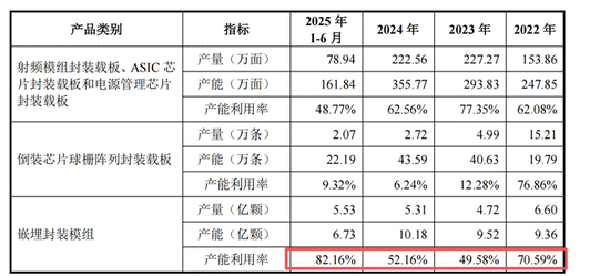 从现有产能利用效率看,嵌埋封装模组确实是公司产品矩阵中的“优等生”。2022年-2025年上半年,该业务产能利用率分别为70.59%、49.58%、52.16%、82.16%,虽呈现“先回落再回升”的波动轨迹,且各期均未实现满产,但横向对比其他核心产品显现出明显优势:2025年上半年,射频模组封装载板、ASIC芯片封装载板与电源管理芯片封装载板的合计产能利用率仅48.77%,倒装芯片球栅阵列封装载板更是低至9.32%。