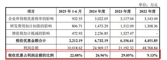 此外,公司利润对税收优惠的依赖度居高不下。2022年-2025年上半年,公司享受的税收优惠金额分别为4451.85万元、6156.61万元、6732.19万元和2212.19万元,占利润总额的比例分别为9.13%、29.05%、26.96%和22.08%,近三年超两成利润来自政策红利。公司也坦承,若未来税收优惠政策调整或无法继续享受,将对经营业绩产生不利影响。