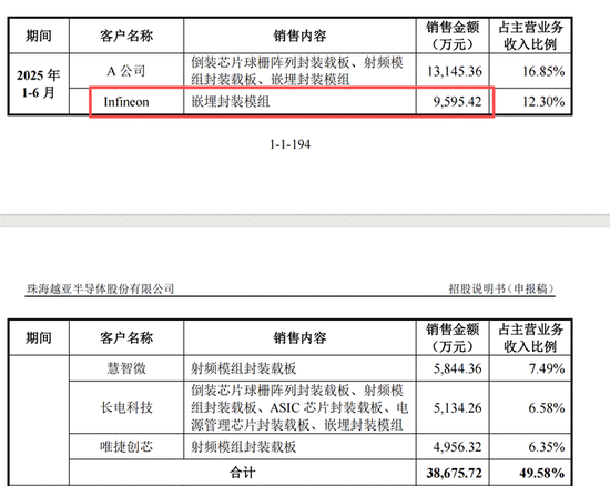 值得关注的是,越亚半导体嵌埋封装模组业务对英飞凌存在着高度的依赖。2025年上半年,英飞凌为越亚半导体贡献0.96亿元嵌埋封装模组收入,占该业务同期总营收2.53亿元的37.9%。与同期公司主营业务第一大客户A公司占比16.85%、前五大客户合计占比49.58%来看,越亚半导体嵌埋封装模组业务对英飞凌的依赖不言而喻。