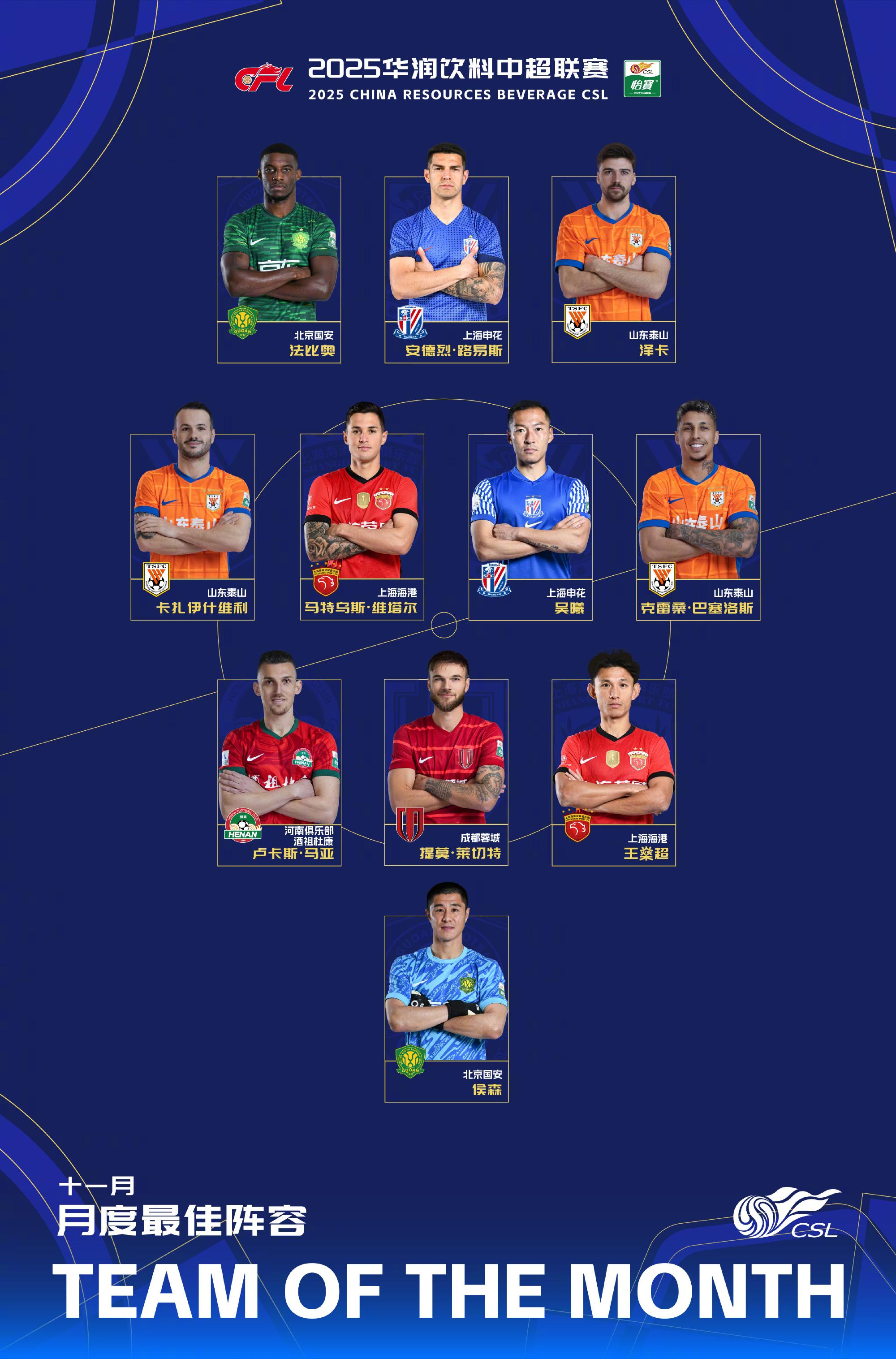 虎扑12月09日讯中超联赛官方公布中超11月最佳阵容,法比奥、吴曦、侯森领衔。