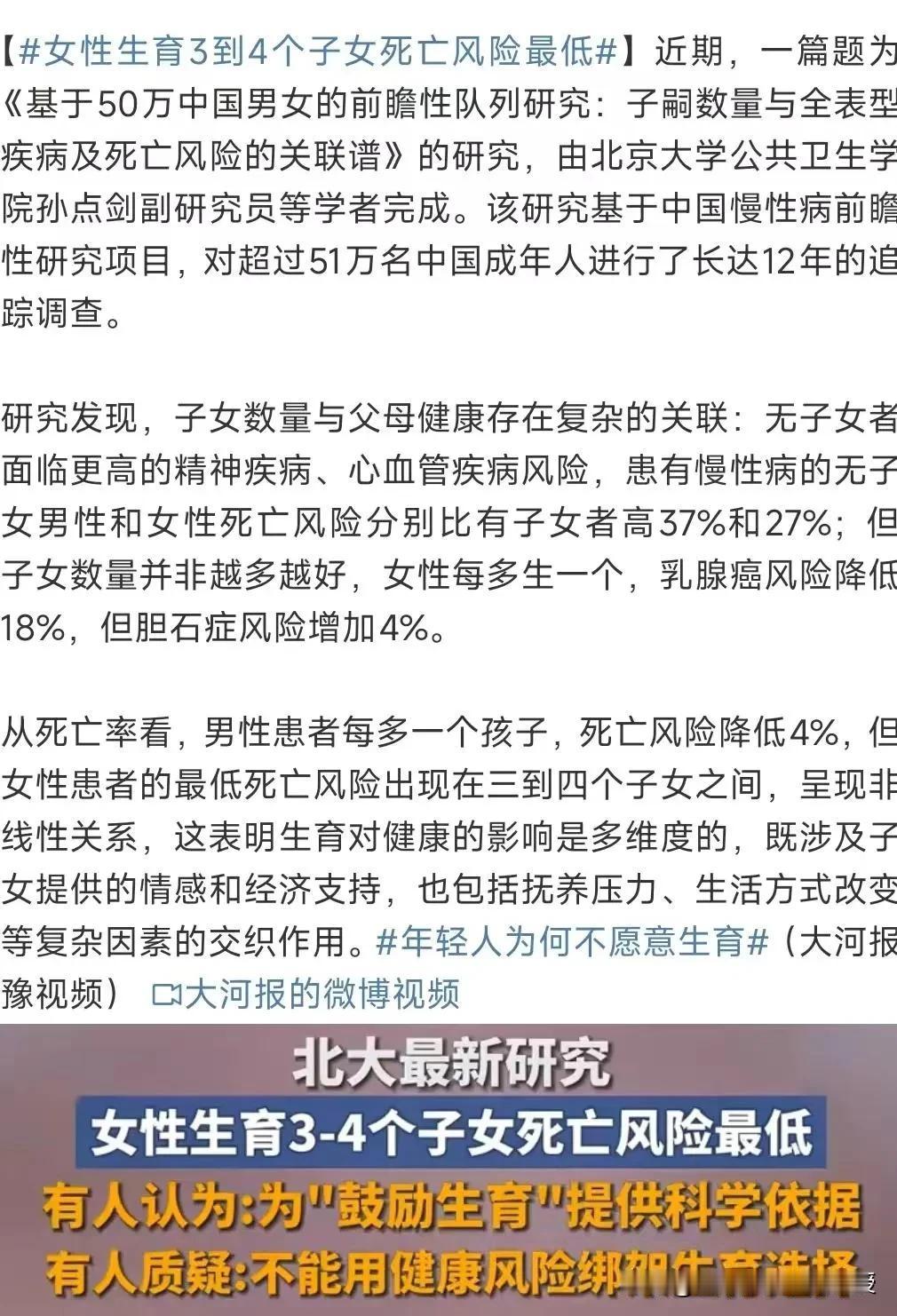 看下图,中外顶尖高校专家真的是各研究各的生育对女性影响,互不干扰,求同存异,大家自己去判断。 最近,斯坦福大学的教授研究出来,女性怀孕会加速衰老5岁,且怀孕次数越多越明显,但是北大的教授研究出女性生育3~4个孩子死亡风险最低。且这个研究结果是对51万名中国成年人进行了长达12年的跟踪调查出的结论,有网友认为,这是为鼓励生育提供科学依据。 其实这两者看似矛盾的结论,实则是衰老维度的生理变化与寿命层面的健康风险,属于不同的研究范畴,看似相悖的结论,实则是两国专家对生育影响的多元解构,并非真正矛盾。