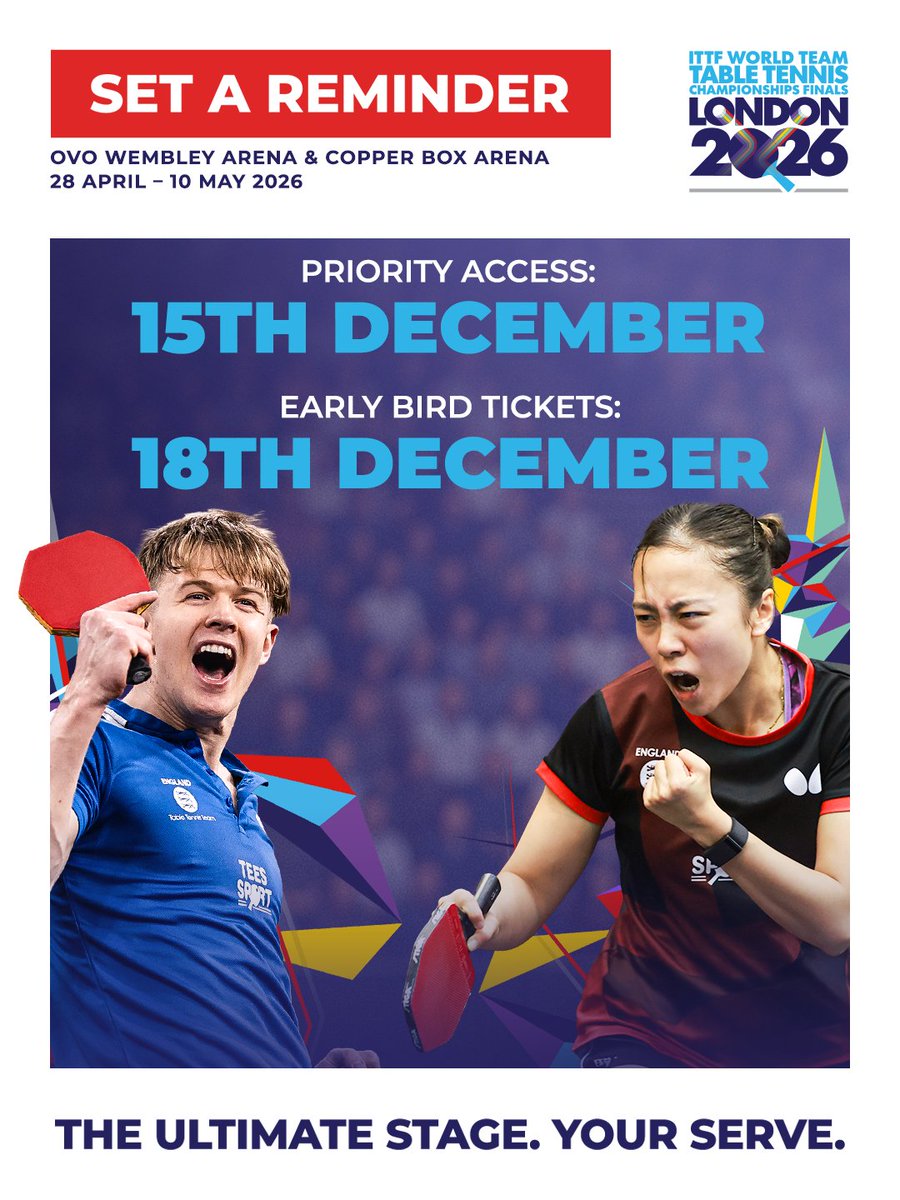 TableTennisEngland报道。世界重返伦敦——回到一切开始的地方。2026年国际乒联世界团体乒乓球锦标赛总决赛门票即将开售。优先购票窗口:12月15-17日(英格兰乒协会员及指定合作伙伴优先购票);早鸟票:12月18日起;公开售票:1月17日起。参与史上规模最大的世乒赛百年纪念版。#London2026#YourServe@ITTFWorld@WTT