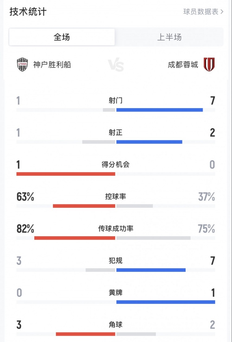 附神户胜利船vs蓉城半场数据: