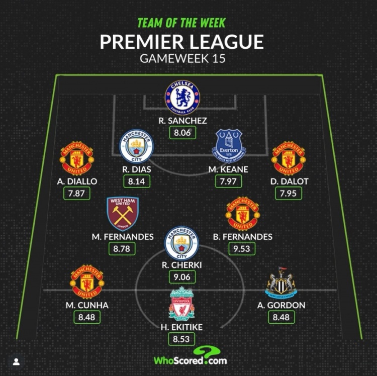 直播吧12月9日讯英超第15轮战罢,whoscored评选出本轮最佳阵容,埃基蒂克、库尼亚领衔锋线、谢尔基、B费坐镇中场。