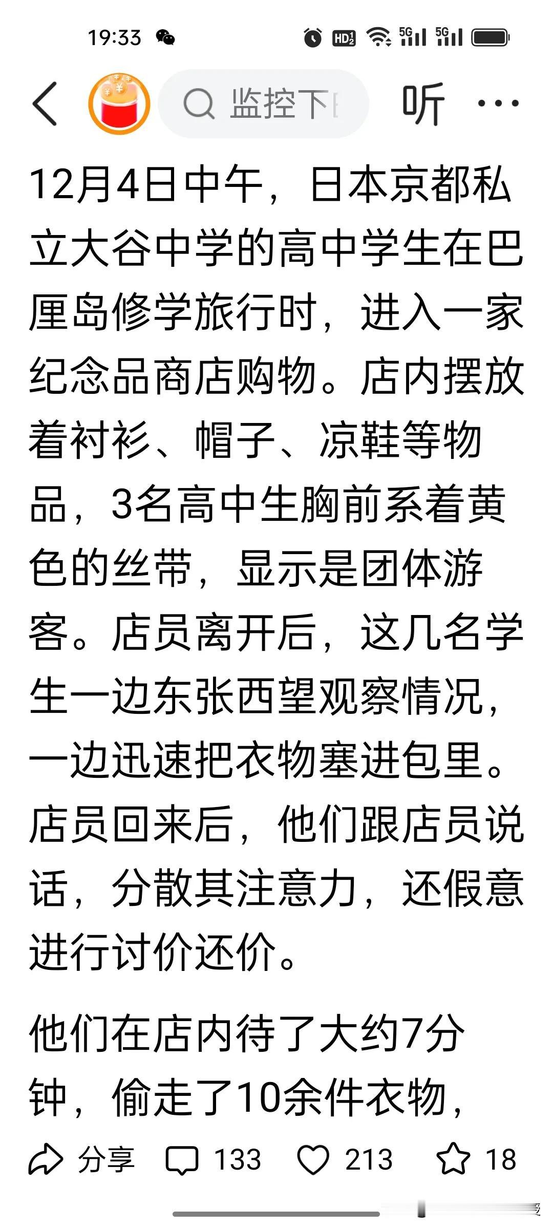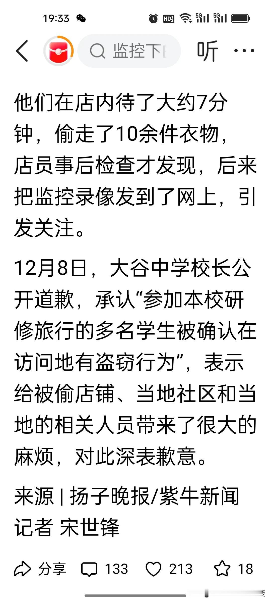 一直觉得日本的学生从小就被严格教育,尤其是待人接物及各方面行为举止上,总是谦逊有礼的感觉,但是刚刚看到《环球网》报道的日本高中生去巴厘岛研学,7分钟偷了商家10件衣服,这个观念就被彻底击碎了。 虽然这个中学的校长道歉了,但是也没有赔偿这个商家,大概是把偷了的衣服还给商家了事,也没付钱,毕竟也是未成年人,大概这几位学生最多也就是被校方批评教育一下,最多再鞠躬深表歉意。