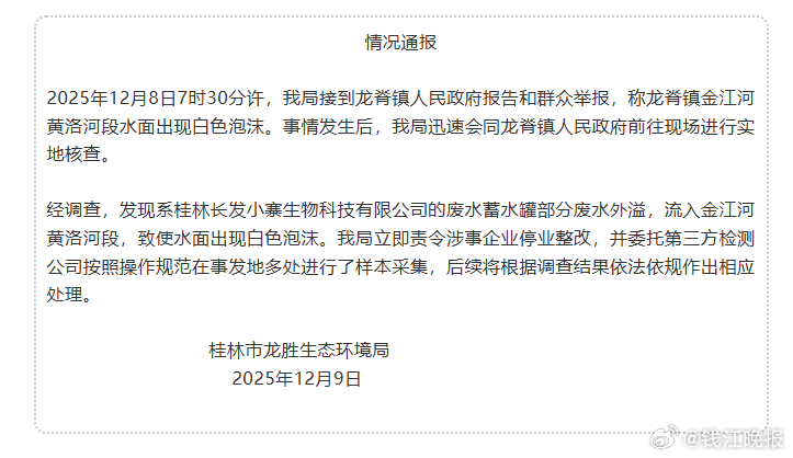 #桂林回应一河道出现大量泡沫#【广西桂林一河道出现大面积泡沫,当地回应:企业废水外溢,正在处理】#桂林一河道大量泡沫为企业废水外溢# 12月8日,有网友报料,广西桂林龙胜县一河道出现大面积泡沫,疑似遭到污染。12月9日,记者从当地相关部门证实,泡沫源头已经锁定,正在现场处理。网友发布的视频显示,一条几十米宽的河道内,白色泡沫顺流而下,百米开外仍清晰可见。在河道一些回湾处,泡沫积了厚厚一层。该网友告诉记者,该处河道位于龙胜县龙脊梯田风景名胜区南侧,河道出现这种情况不仅对当地生态环境造成污染,更影响了当地旅游形象,“上个月也排过一次,说管子破了,这个月又排。”11月9日中午,针对网友反映的情况,桂林市龙胜生态环境局发布情况通报称,事情发生后,该局迅速会同龙脊镇人民政府前往现场进行实地核查。经调查,发现系桂林长发小寨生物科技有限公司的废水蓄水罐部分废水外溢,流入金江河黄洛河段,致使水面出现白色泡沫。该局立即责令涉事企业停业整改,并委托第三方检测公司按照操作规范在事发地多处进行了样本采集,后续将根据调查结果依法依规作出相应处理。记者通过检索发现,桂林长发小寨生物科技有限公司主要从事生物发酵技术开发,日化用品、化妆品生产、销售,中药材加工、销售;农副产品加工、技术开发、销售等。当天下午,记者分别电话联系了桂林市龙胜生态环境局和龙脊镇人民政府询问处置进展。桂林市龙胜生态环境局工作人员回应称,目前该单位相关人员仍在现场处置,“我们现在还在调查处理中。”龙脊镇人民政府则工作人员表示,一切以官方通报为准。(潮新闻 记者 季建荣 受访者供图)