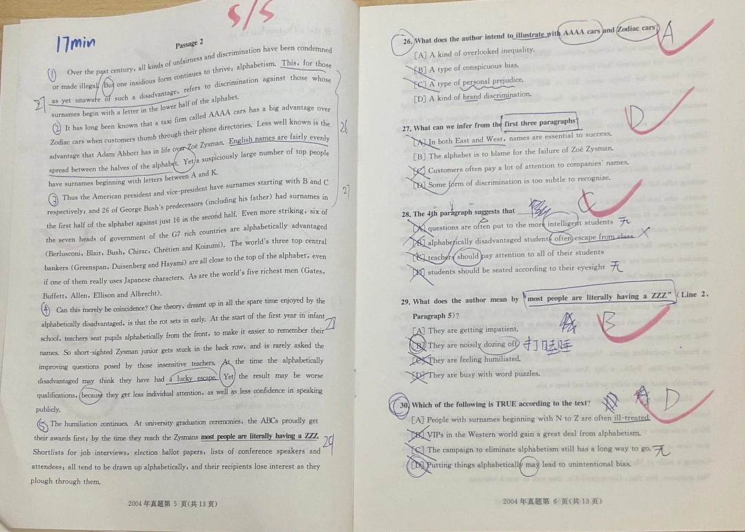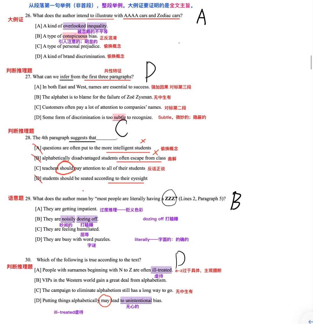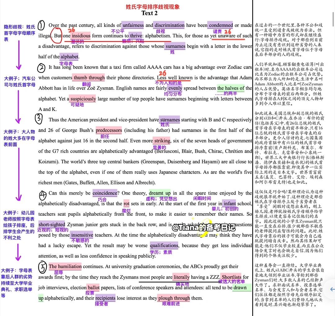 🌟 文章揭示了社会生活中存在的一种隐蔽的不平等现象:【姓氏字母排序歧视】。作者采用了【下定义、举例子、假设】等多种写作手法、分别从“姓氏排序靠前者享有的优势“和“排序靠后者处于的劣势”正反两面说明现象,详细分析了这一人们也许从未意识到的社会问题。