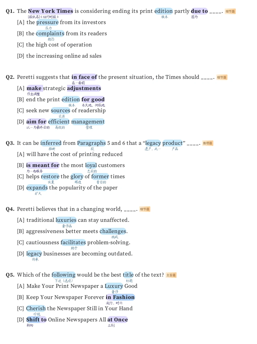 参考(唐迟方法论➕黄皮书解析) ~~~~~~~~~ 🌟全文思路: 全文以“《纽约时报》拟停纸质版发行”为引,谈到纸质版报纸的困境及出路,并通篇引述网络媒体代表BuzFeed首席执行官观点指出纸质版报纸当前与其说是考虑停印,还不如加速将其转型为专为最忠实读者而做的传承产品。 🌟段落逻辑 1⃣️ 开门见山,直陈纸质版《纽约时报》的未来:终将停印。 2⃣️ 分析原因:实体报纸(包括纸版《纽约时报》)成本过高、读者流失、收益下滑。 3⃣️ 引述BuzzFeed CEO Peretti观点:不能仓促终止,否则将会是个错误。 4⃣️ 继续引述Peretti观点:要恰当处理纸版业务—加快转型而非仓促终结 5⃣️ 进而指出Pereti应对之策:调整策略,将纸版转型为传承产品。 6⃣️ 继而阐释具体理念:利用“最忠实顾客愿意为所信赖产品买单”这一心理专门为忠实读者制作纸版报。 7⃣️ 最后由人及己,指出 BuzzFeed如若深陷类似纸版报窘境当有的做法:积极进取、勇往直前。