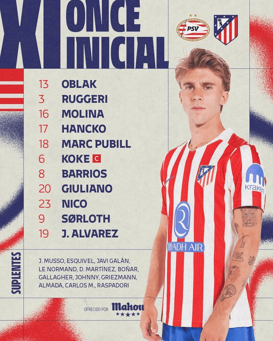 虎扑12月10日讯欧冠联赛阶段第6轮,马竞客场挑战埃因霍温,赛前,双方公布了本场比赛首发名单。