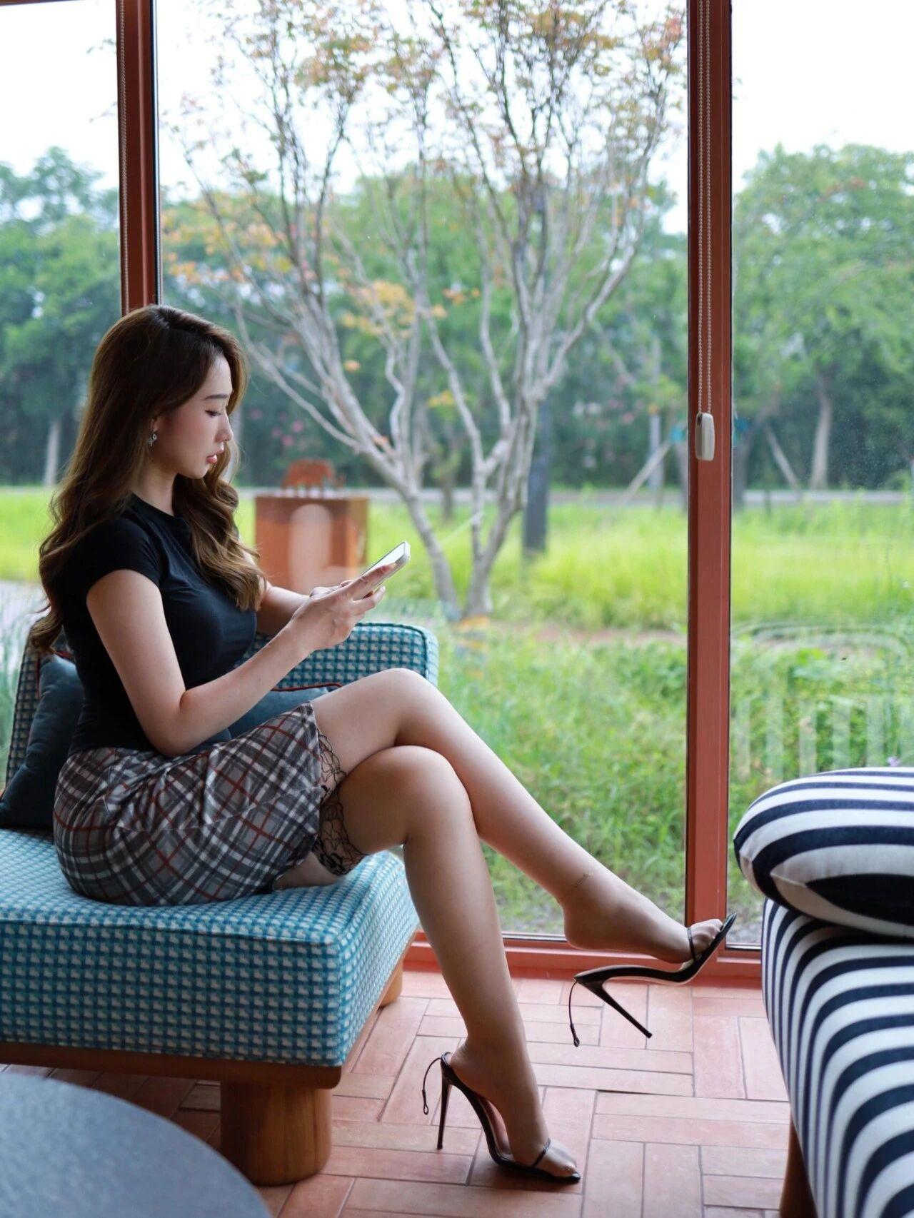 《午后·窗边·与自己》 阳光斜斜地穿过百叶窗,在木地板上织出细碎的光斑,像谁不小心打翻了一盒金粉。我蜷在蓝白格子的扶手椅里,指尖无意识摩挲着裙摆的褶皱,蕾丝吊带袜的纹路在皮肤上印出细密的影子。 窗外是无尽的绿。爬山虎顺着老墙攀援而上,新抽的藤蔓正试探着触碰玻璃,草坪上有麻雀蹦跳着啄食草籽,风过时,整片绿浪便簌簌地晃动,像谁在轻轻抖开一匹浸了薄荷香的绸缎。 高跟鞋的细跟悬在半空,随着呼吸微微摇晃。皮质座椅传来温润的凉意,耳垂上的银坠子偶尔碰着脖颈,带起一阵细碎的痒。这个午后太安静了,安静得能听见光线流淌的声音,能数清尘埃在光柱里跳了多少支华尔兹。 突然想起里尔克的诗句:"我认出风暴而激动如大海,我舒展开又蜷缩回去,我挣脱自身,独自置身于伟大的风暴中。"此刻没有风暴,只有阳光、绿意和缓慢流淌的时光。但或许真正的风暴,是那些在血管里奔涌却未曾说出口的悸动,是灵魂深处永远在破茧的蝴蝶。 裙角的格子与椅子的纹路在某个角度完美重叠,仿佛命运早就写好了契合的密码。我望着玻璃上模糊的倒影,那个穿着黑色针织衫的女孩,她的眼睛里盛着整个夏天的慵懒,还有一丝不肯妥协的倔强。 这样的时刻,适合泡一杯伯爵茶,看热气在光里织出透明的网;适合把未读完的诗集摊在膝头,让文字随着光影在纸页上跳舞;更适合什么也不做,只是把自己种在时光里,等某个瞬间突然开出花来。 当暮色开始染红天际线,我会起身离开。但此刻,请允许我偷走这一寸光阴,把它折成书签,夹在人生里最柔软的那一页。毕竟有些美好,注定要独自享用,就像窗台上的绿萝,永远在无人注视时,悄悄抽出最新嫩的芽。