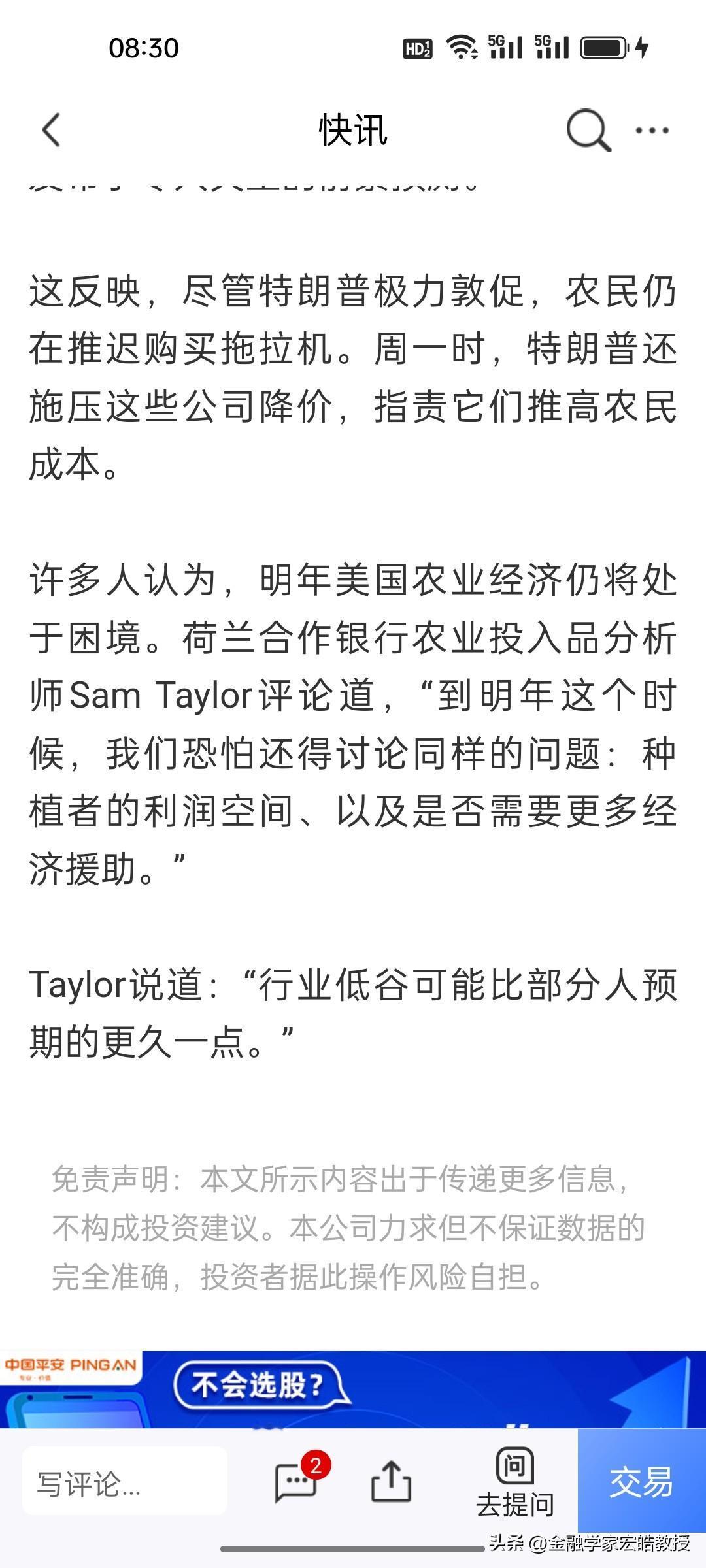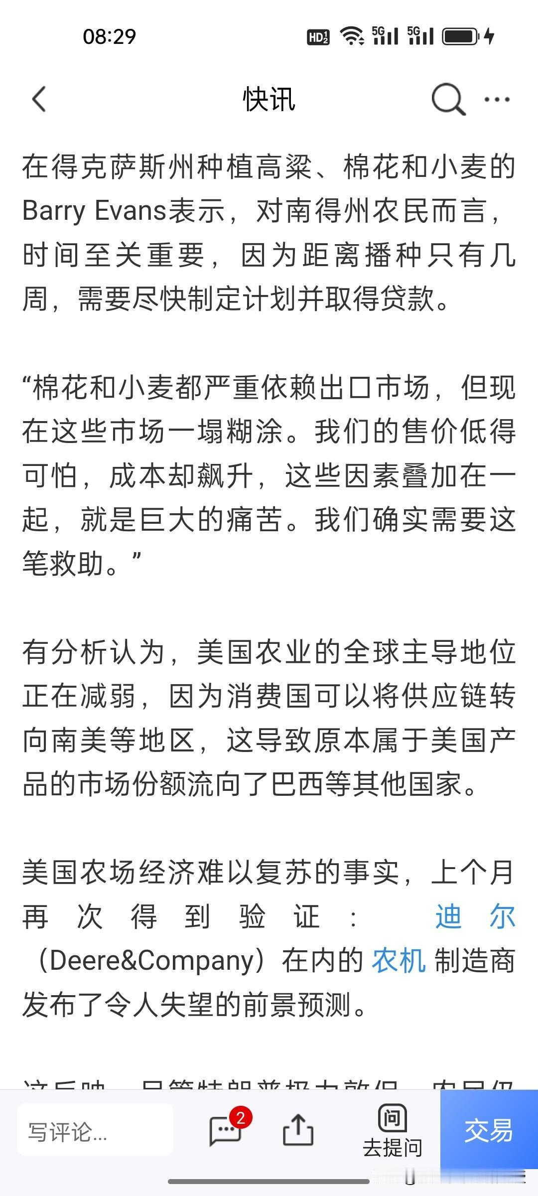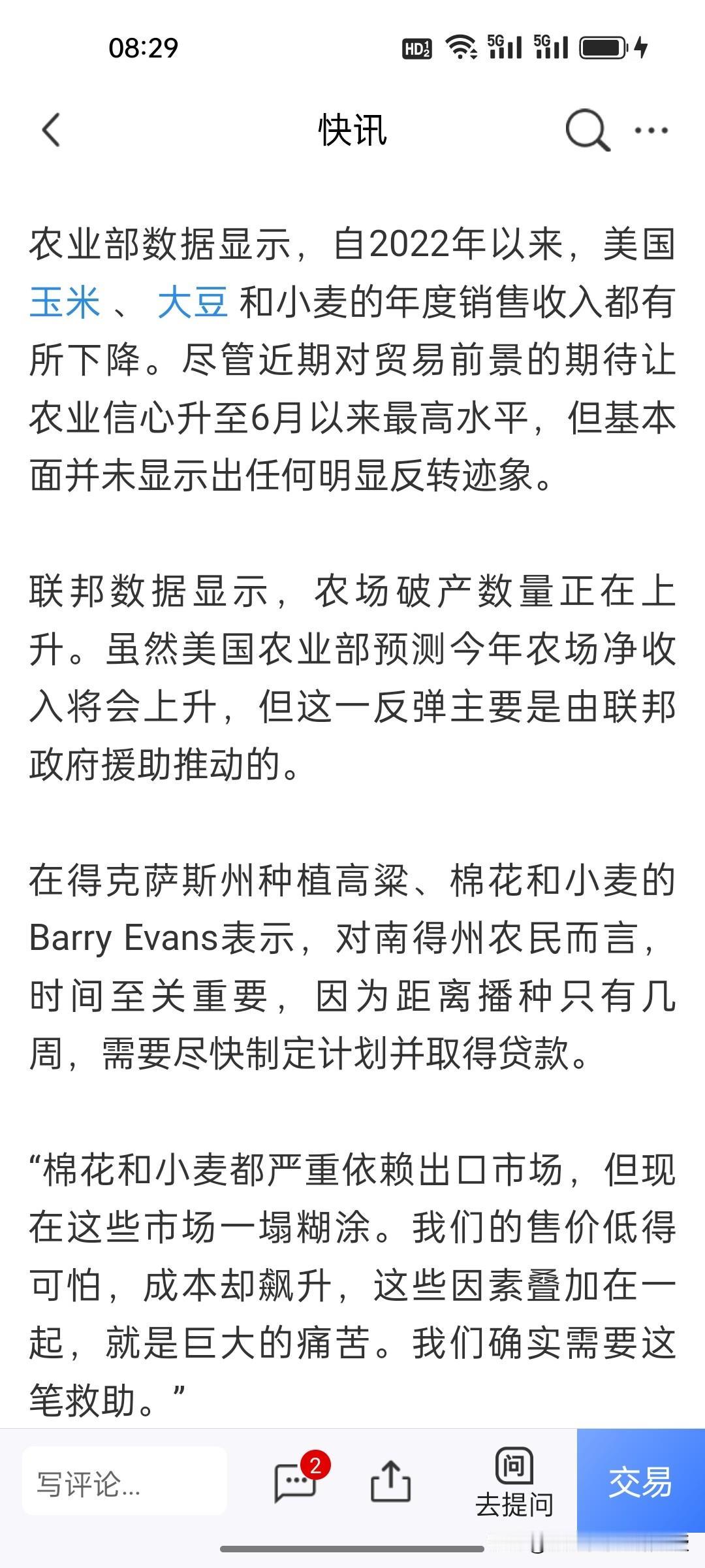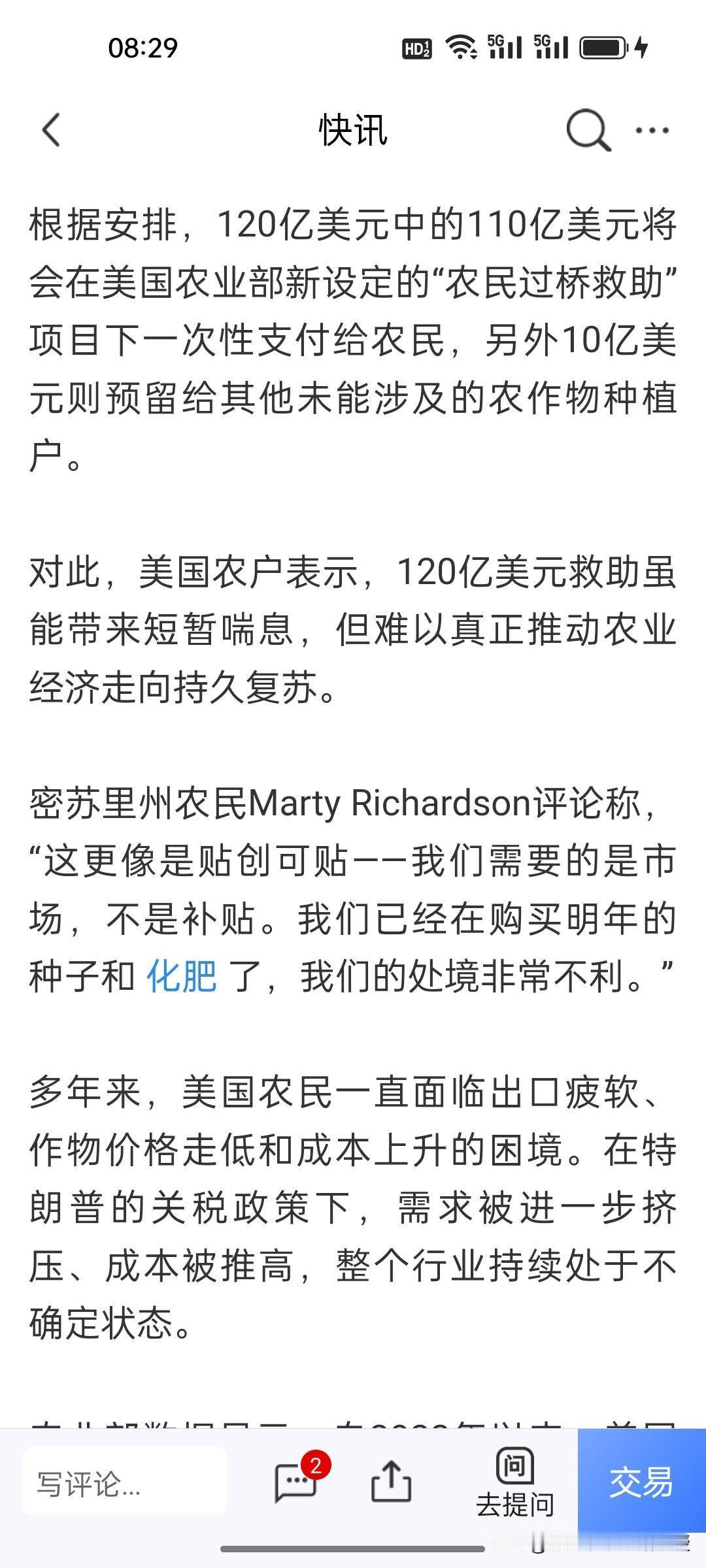 砸120亿补贴!特朗普急救美国农民却遭嫌弃,高关税不取消,农业翻身就是空谈! 刚刚,特朗普慷慨宣布向美国农民发放120亿美元的补贴,其中110亿直接发到农民的手中,可是农民却不买账,认为这是“饮鸩止渴”,给他们贴上了“创口贴”,不是“授人以渔”的表现,还悲观的认为美国的农业经济会依旧不振。因为目前美国的棉花和小麦完全依赖出口,但是关税的高企,依旧面临出口疲软的困局。美国与世界各地实施的高关税,导致出口减少,最直接的受害者就是美国农民,虽然中国已经恢复美国的大豆进口,明年美国的农业可能依旧是低谷期。 特朗普政府还是没有意识到,如今的贸易保护主义已经不能再维持美国的霸权主义,美国应摒弃贸易保护主义,下调高关税以打通农产品出口通道,立足国际市场需求调整种植结构,同时建立长效农业扶持机制,而非依赖短期“大输血”,才能真正盘活农业经济。