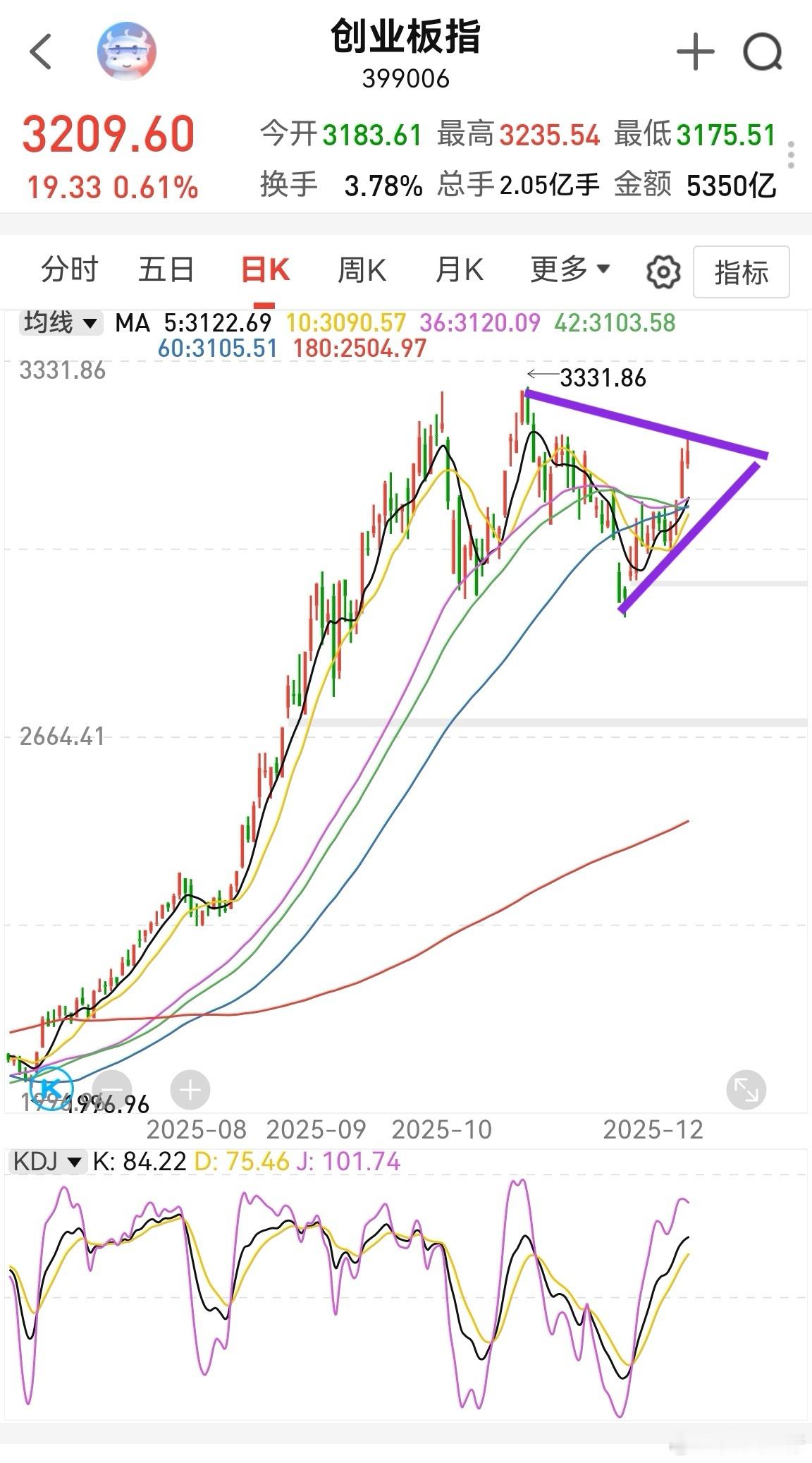 创业板的波动要比上证指数大多了,这一点要注意。目前两者都在走一个楔形趋势,一旦均