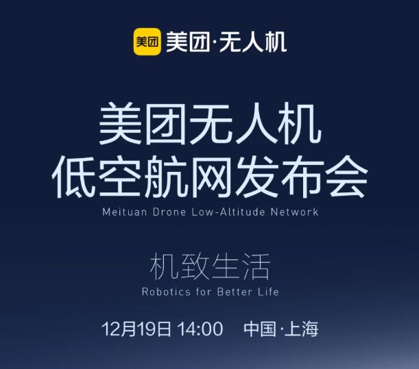12月10日,据美团无人机官微消息,2025年美团无人机低空航网发布会将于12月19日在上海举行。据了解,此次发布会上多款新品将集中亮相。