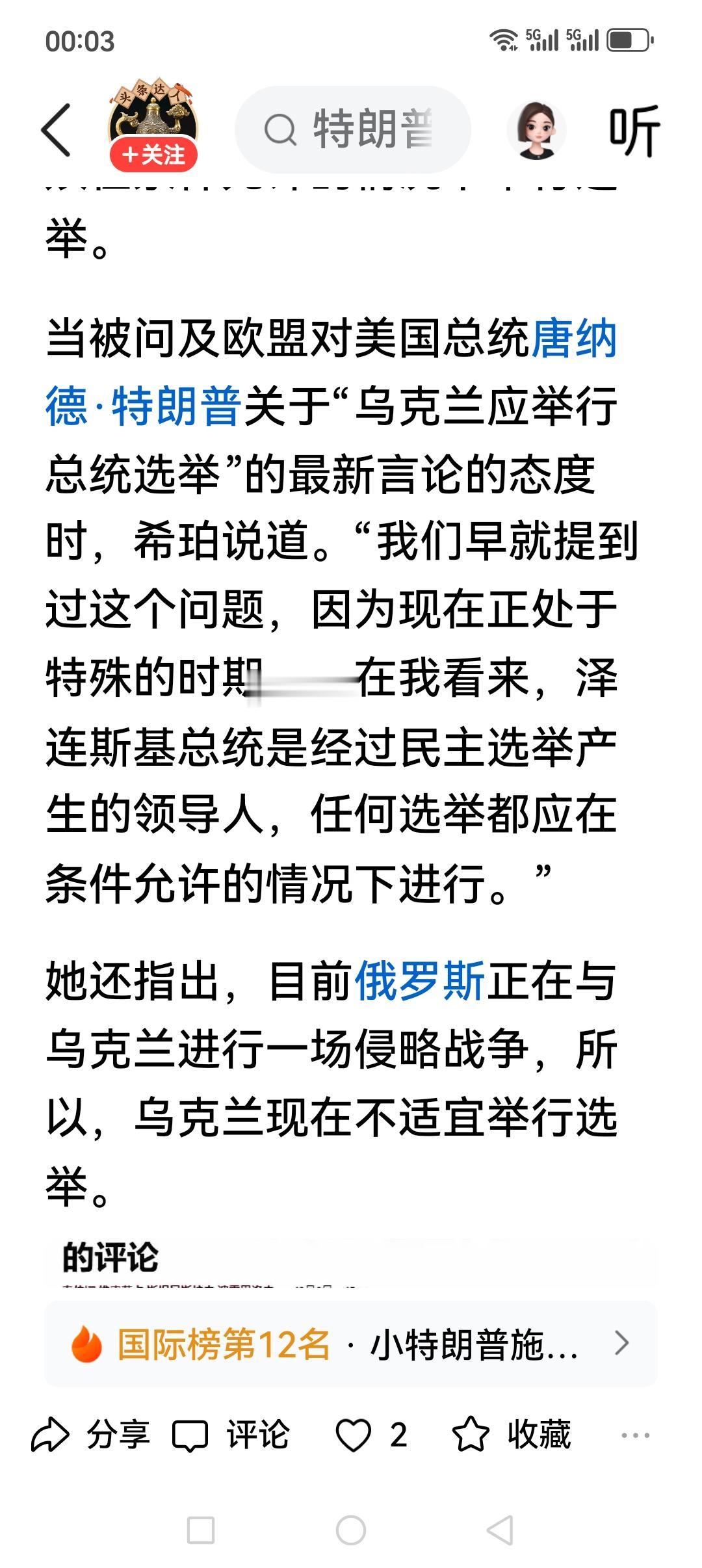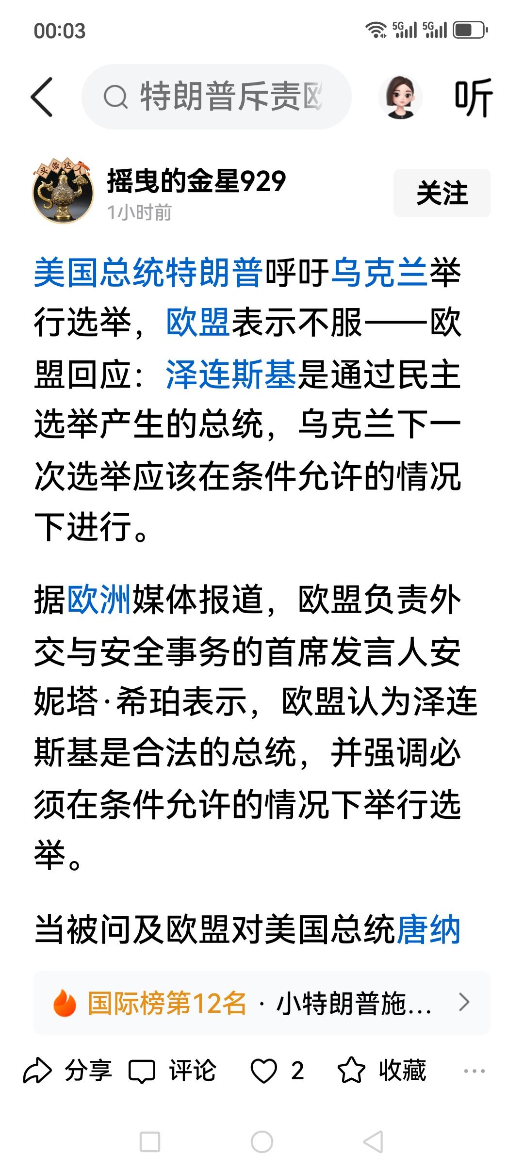 特朗普的想法和说法和普京如出一辙,几乎相同! 特朗普说乌克兰不是一个民主国家,泽连斯基的总统不合法…乌克兰人应该选举,而普京也一直这样说… 是不是民主国家不能凭空想象,乌克兰办公室主任因受到腐败案牵连,已经引咎辞职。而特朗普的特使因为通俄事件,一直活跃也没辞职。民主与否可见一斑。 至于选举,泽连斯基回应特朗普,如果美国和欧洲盟友可以为乌克兰提供安全保障,乌克兰愿意在60天之内选举~ 很显然美国人不会把美军部署到乌克兰,和俄罗斯交战。乌克兰镜内有71万俄军。随时要应对俄罗斯的导弹和无人机的攻击~ 特朗普提出此等问题,更显得其脑袋空空如也,像小儿科般说出如此幼稚细嫩的问题…