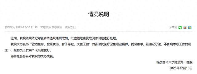 12月10日上午,大皖新闻记者联系上福建医科大学附属第一医院宣传部求证,工作人员没有正面回答,称医院稍后会对此事作出回应。其后,福建医科大学附属第一医院发布情况说明称,近期,该院依规依纪对张水华违规兼职取酬、以虚假理由获取调休问题进行处理。该院大力弘扬“敬佑生命、救死扶伤、甘于奉献、大爱无疆”的新时代医疗卫生职业精神,并重申,在遵纪守法、不影响本职工作的前提下,鼓励员工发展个人兴趣爱好。