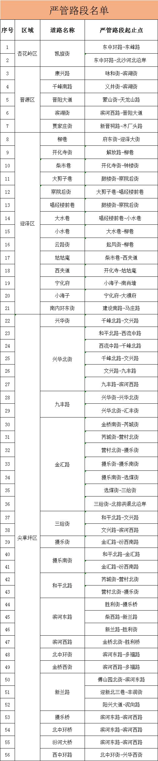为改善城市道路交通环境,规范停车秩序,提高道路通行效率,结合目前市区停车现状和群众反映较为突出的停车乱点,根据《中华人民共和国道路交通安全法》《中华人民共和国道路交通安全法实施条例》《山西省实施〈中华人民共和国道路交通安全法〉办法》及相关规程,公安机关交通管理部门经过前期研判和评估,及在前阶段公布两批严管示范街的基础上,决定将下列道路新增(启用)为严格管理道路(简称“严管道路”),具体事项公布如下: